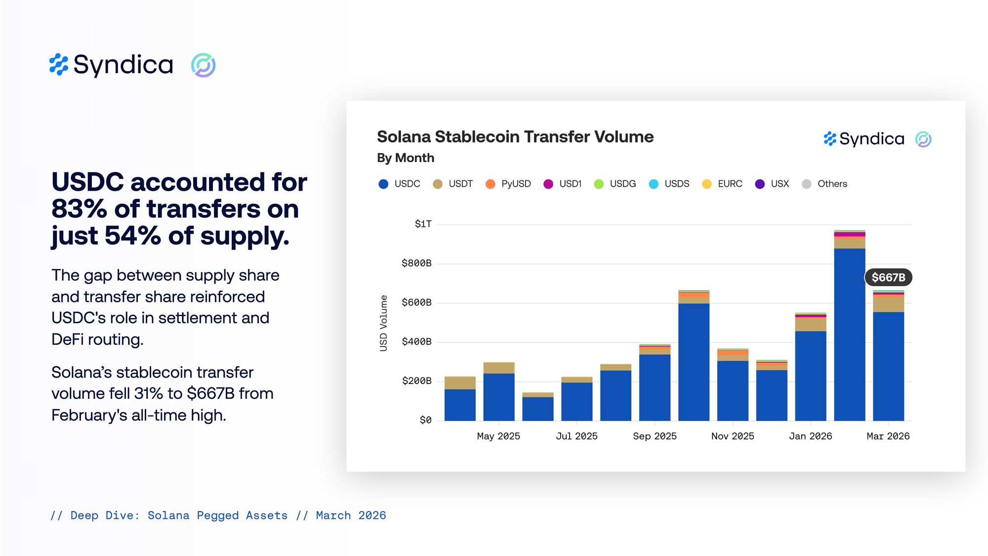 The gap between supply share and transfer share reinforced USDC's role in settlement and DeFi routing. Solana’s stablecoin transfer volume fell 31% to $667B from February's all-time high.