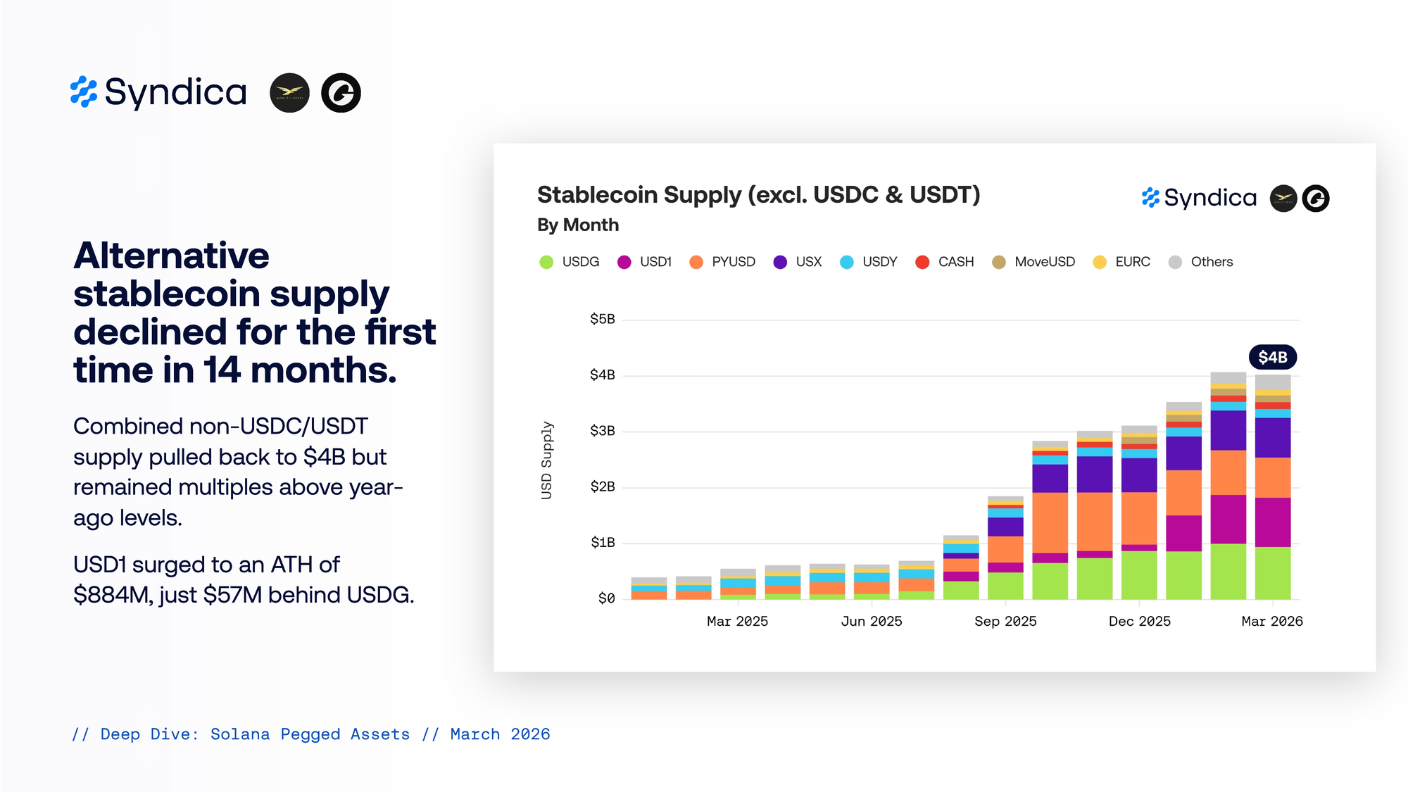 Combined non-USDC/USDT supply pulled back to $4B but remained multiples above year-ago levels. USD1 surged to an ATH of $884M, just $57M behind USDG.