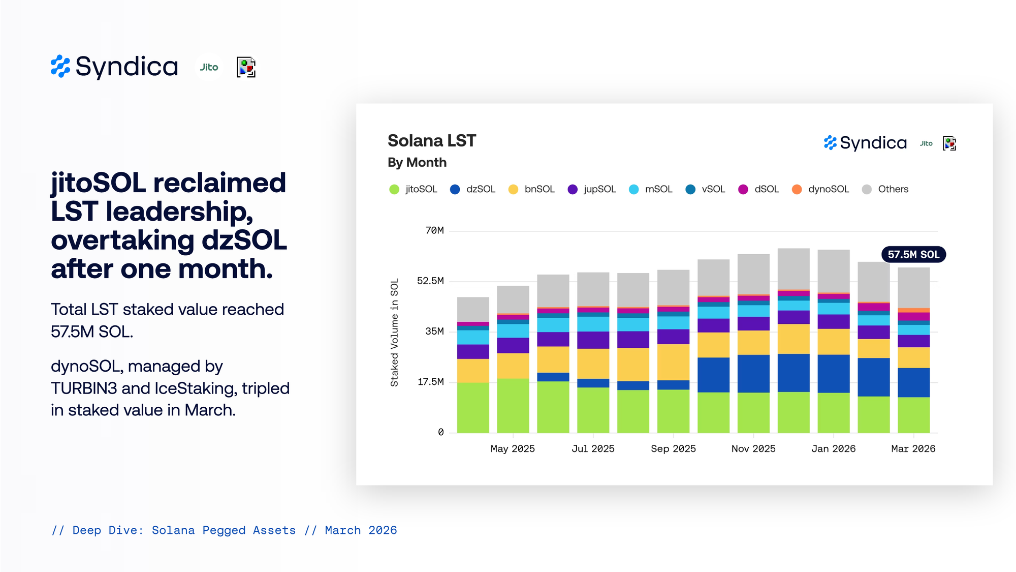 Total LST staked value reached 57.5M SOL. dynoSOL, managed by TURBIN3 and IceStaking, tripled in staked value in March.