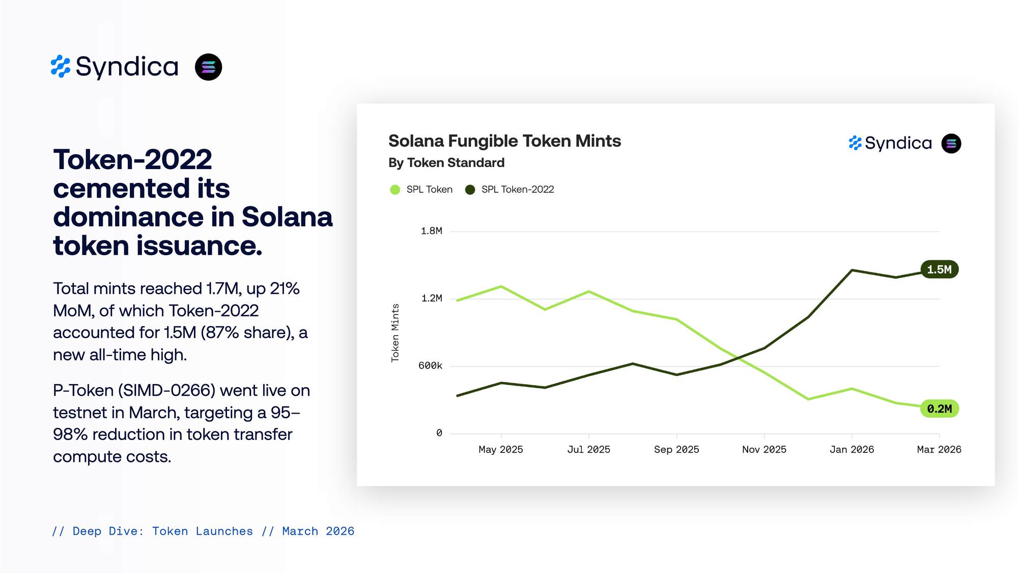 Total mints reached 1.7M, up 21% MoM, of which Token-2022 accounted for 1.5M (87% share), a new all-time high. P-Token (SIMD-0266) went live on testnet in March, targeting a 95-98% reduction in token transfer compute costs.