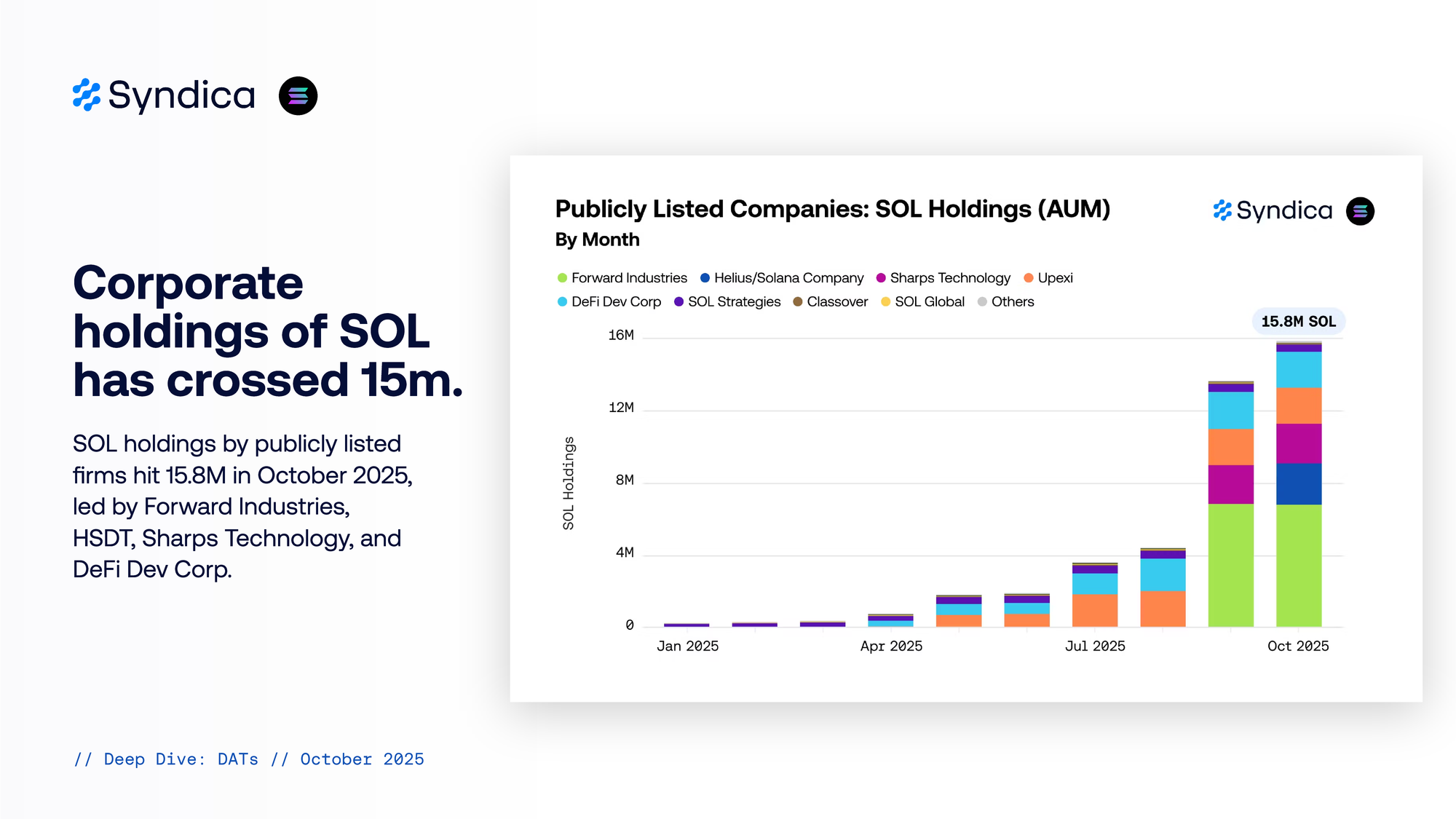 Corporate holdings of SOL has crossed 15m. SOL holdings by publicly listed firms hit 15.8M in October 2025, led by Forward Industries, HSDT, Sharps Technology, and DeFi Dev Corp.