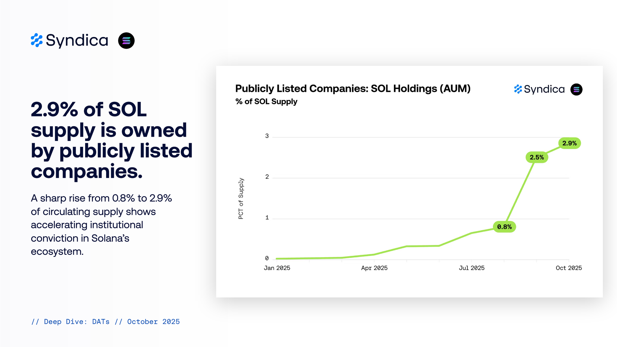 2.9% of SOL supply is owned by publicly listed companies. A sharp rise from 0.8% to 2.9% of circulating supply shows accelerating institutional conviction in Solana’s ecosystem.