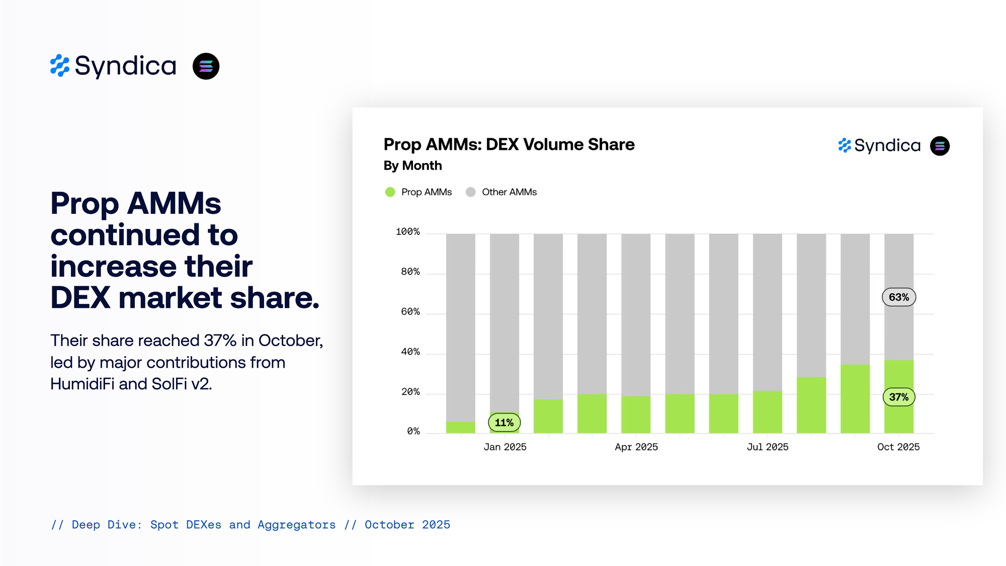 Prop AMMs continued to increase their DEX market share. Their share reached 37% in October, led by major contributions from HumidiFi and SolFi v2.