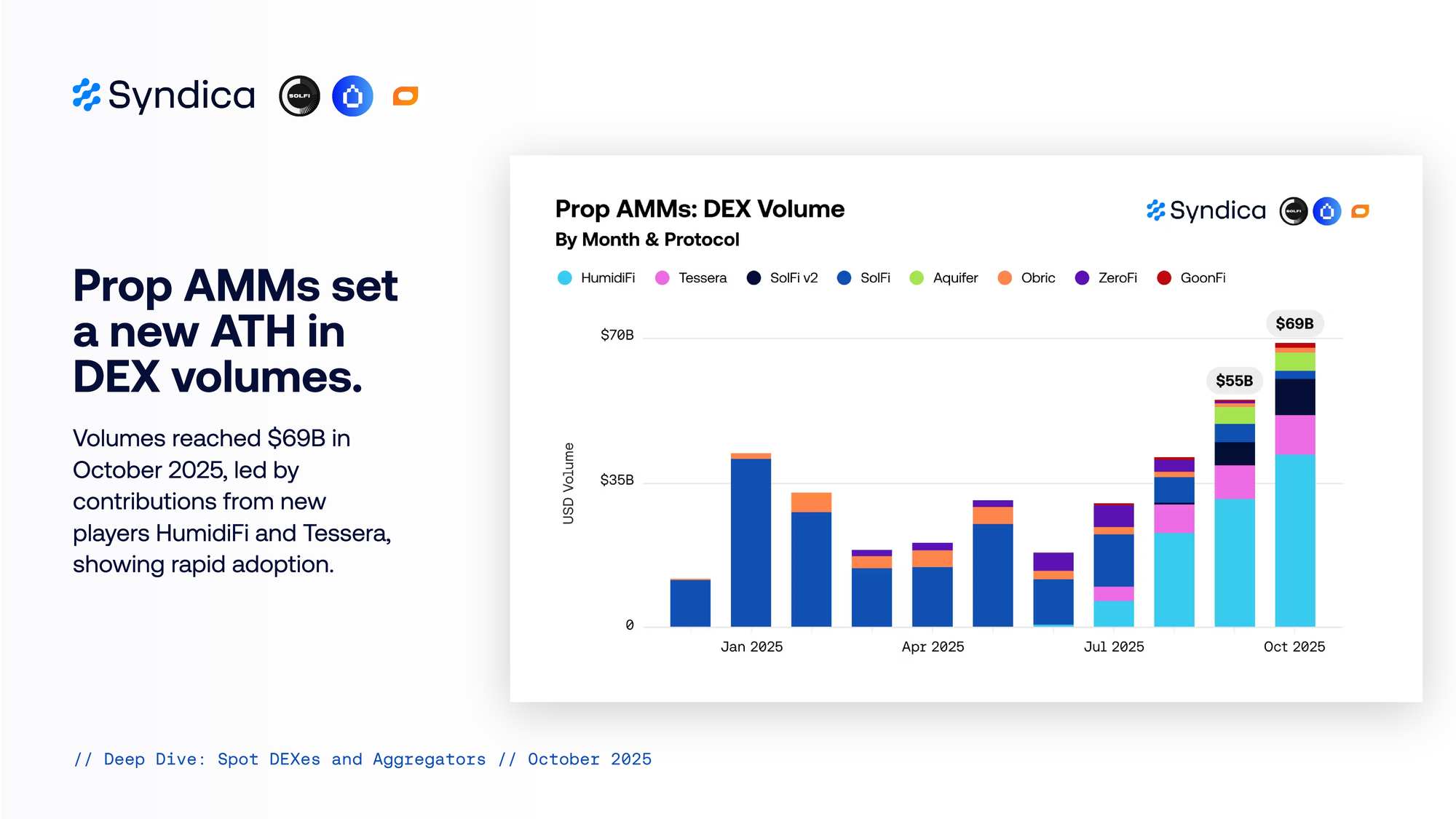 Prop AMMs set a new ATH in DEX volumes. Volumes surpassed $68B in October 2025, led by contributions from new players HumidiFi and Tessera, showing rapid adoption.