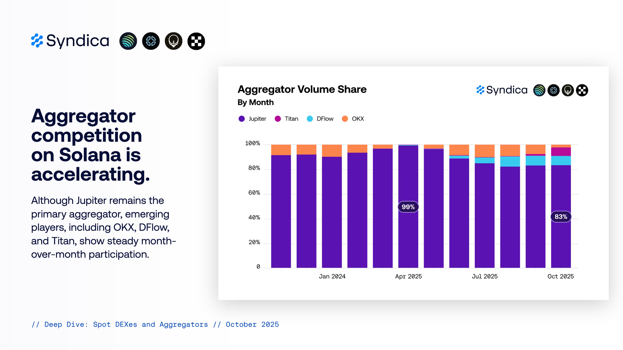 Aggregator competition on Solana is accelerating. Although Jupiter remains the primary aggregator, emerging players, including OKX, DFlow, and Titan, show steady month-over-month participation.