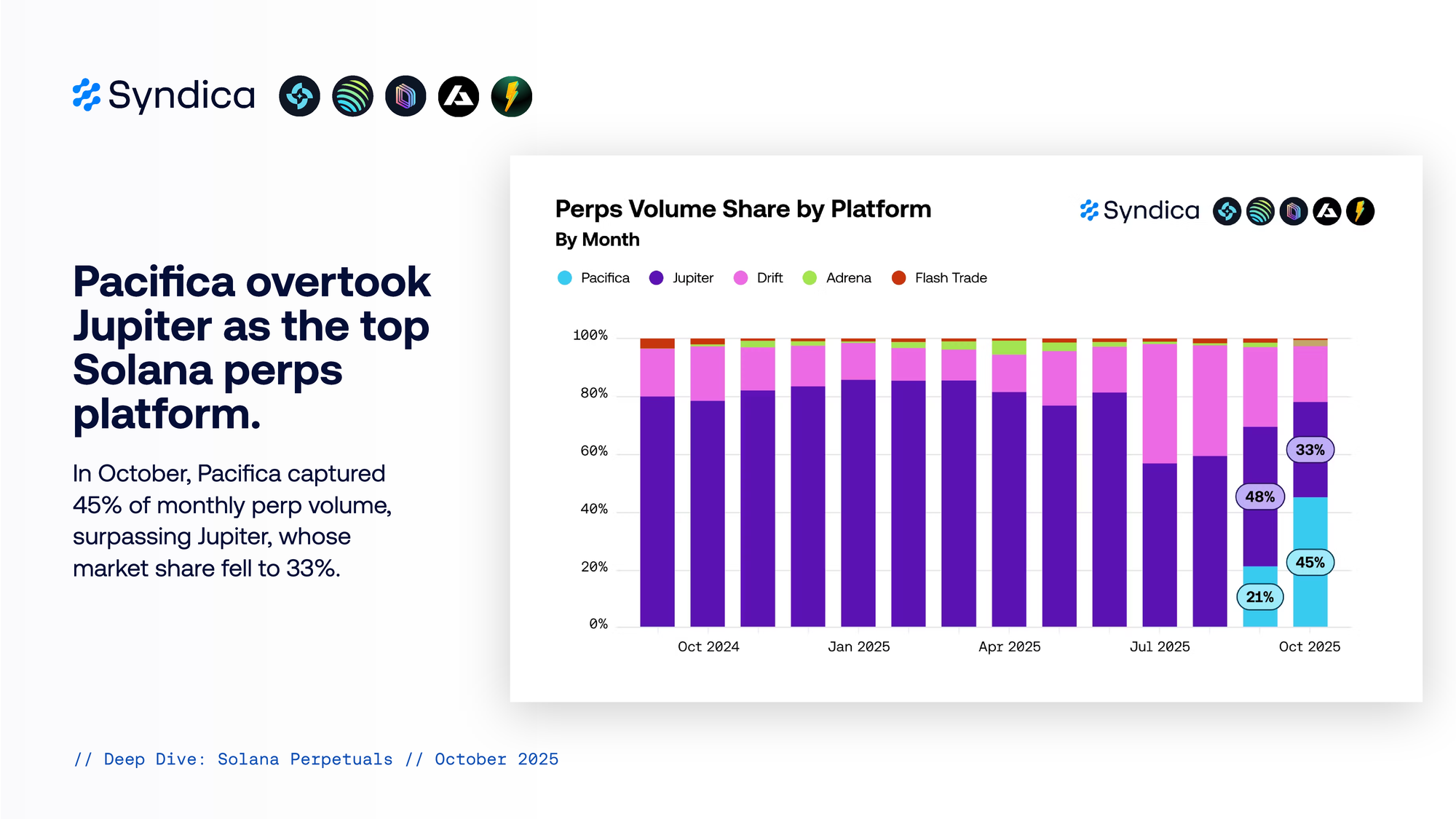 Pacifica overtook Jupiter as the top Solana perps platform. In October, Pacifica captured 45% of monthly perp volume, surpassing Jupiter, whose market share fell to 33%.