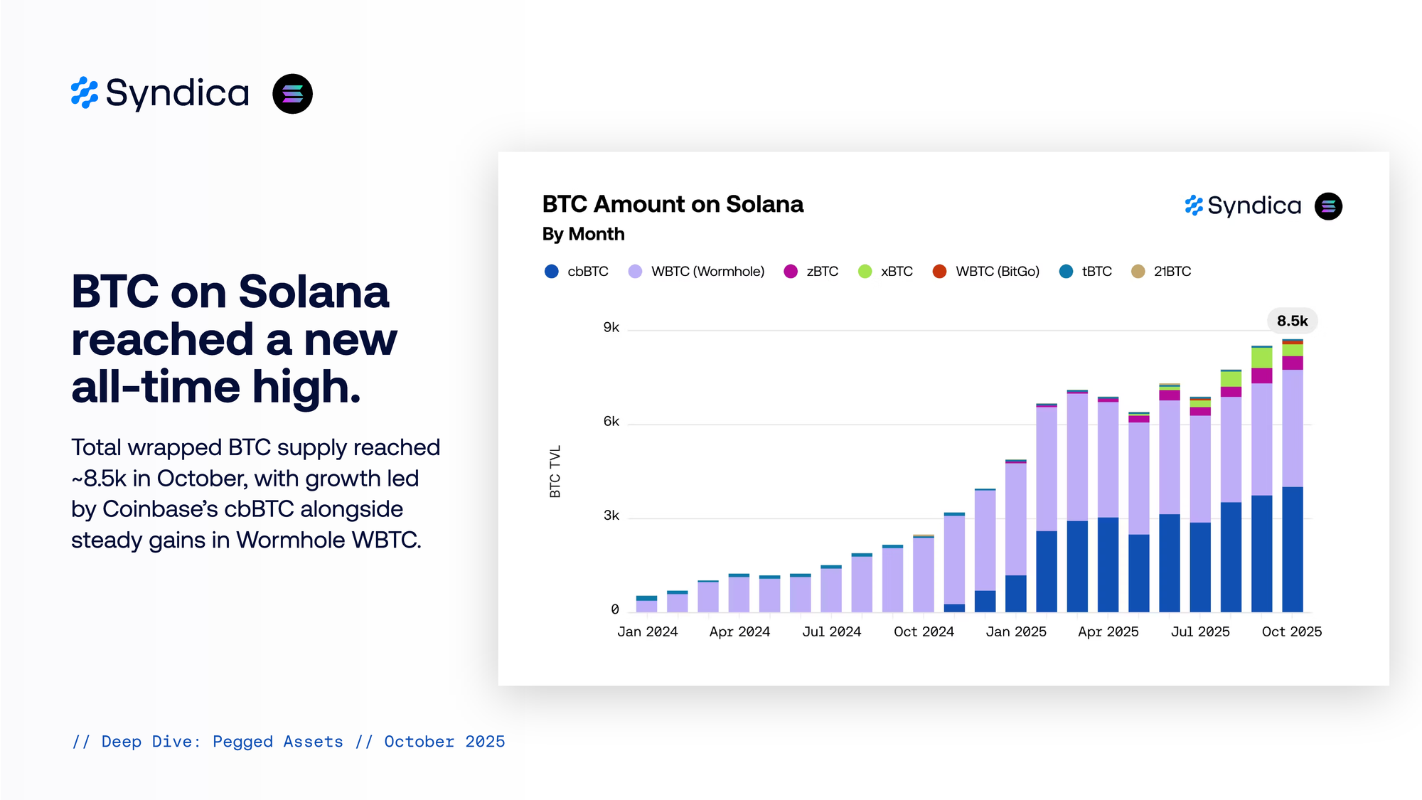 BTC on Solana reached a new all-time high. Total wrapped BTC supply reached ~8.5k in October, with growth led by Coinbase’s cbBTC alongside steady gains in Wormhole WBTC.