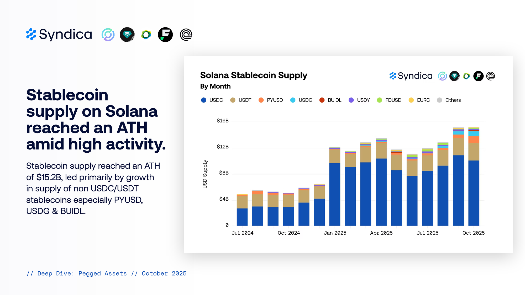 Stablecoin supply on Solana reached an ATH amid high activity. Stablecoin supply reached an ATH of $15.2B, led primarily by growth in supply of non USDC/USDT stablecoins especially PYUSD, USDG & BUIDL.