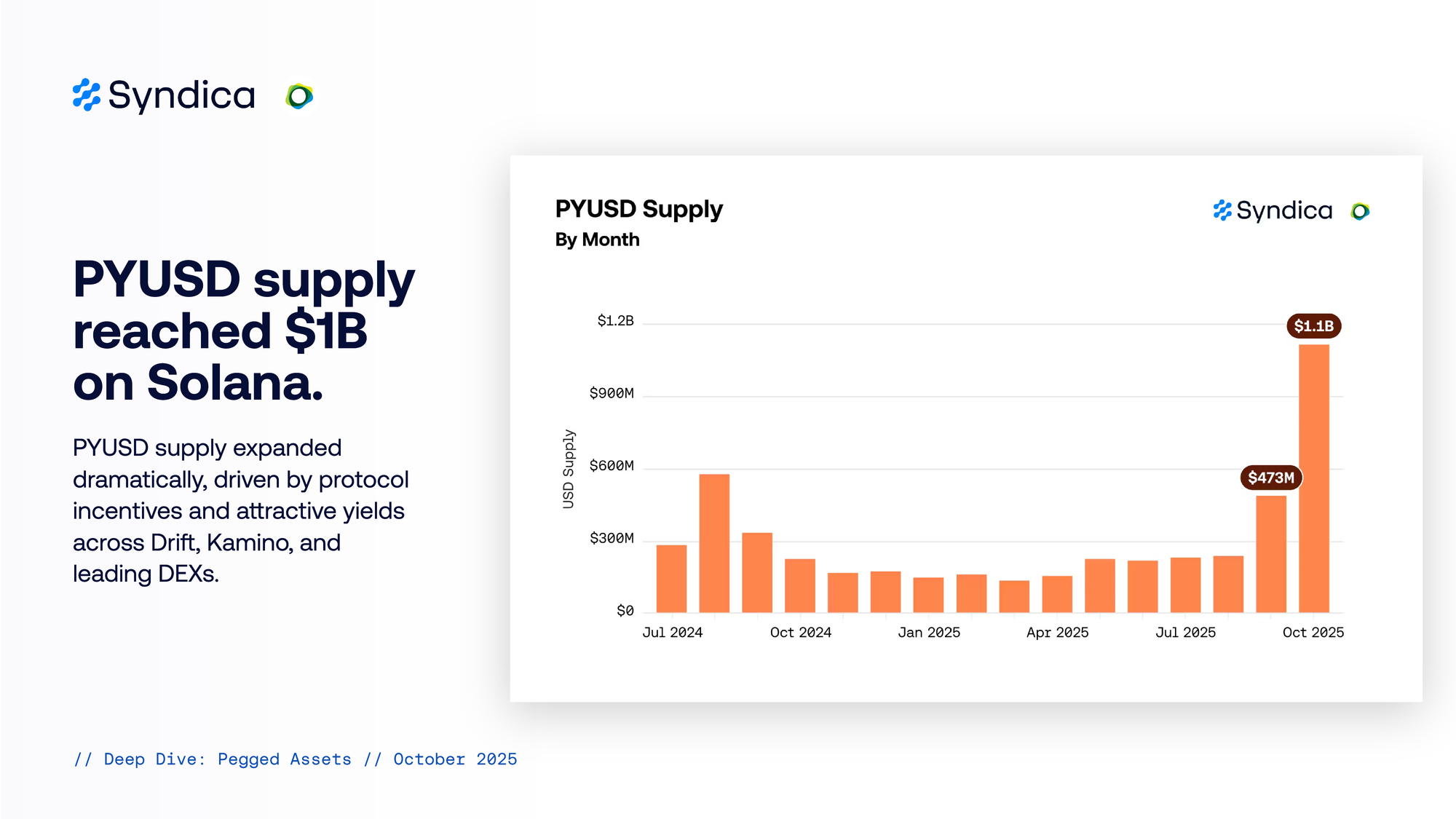 PYUSD supply reached $1B on Solana. PYUSD supply expanded dramatically, driven by protocol incentives and attractive yields across Drift, Kamino, and leading DEXs.