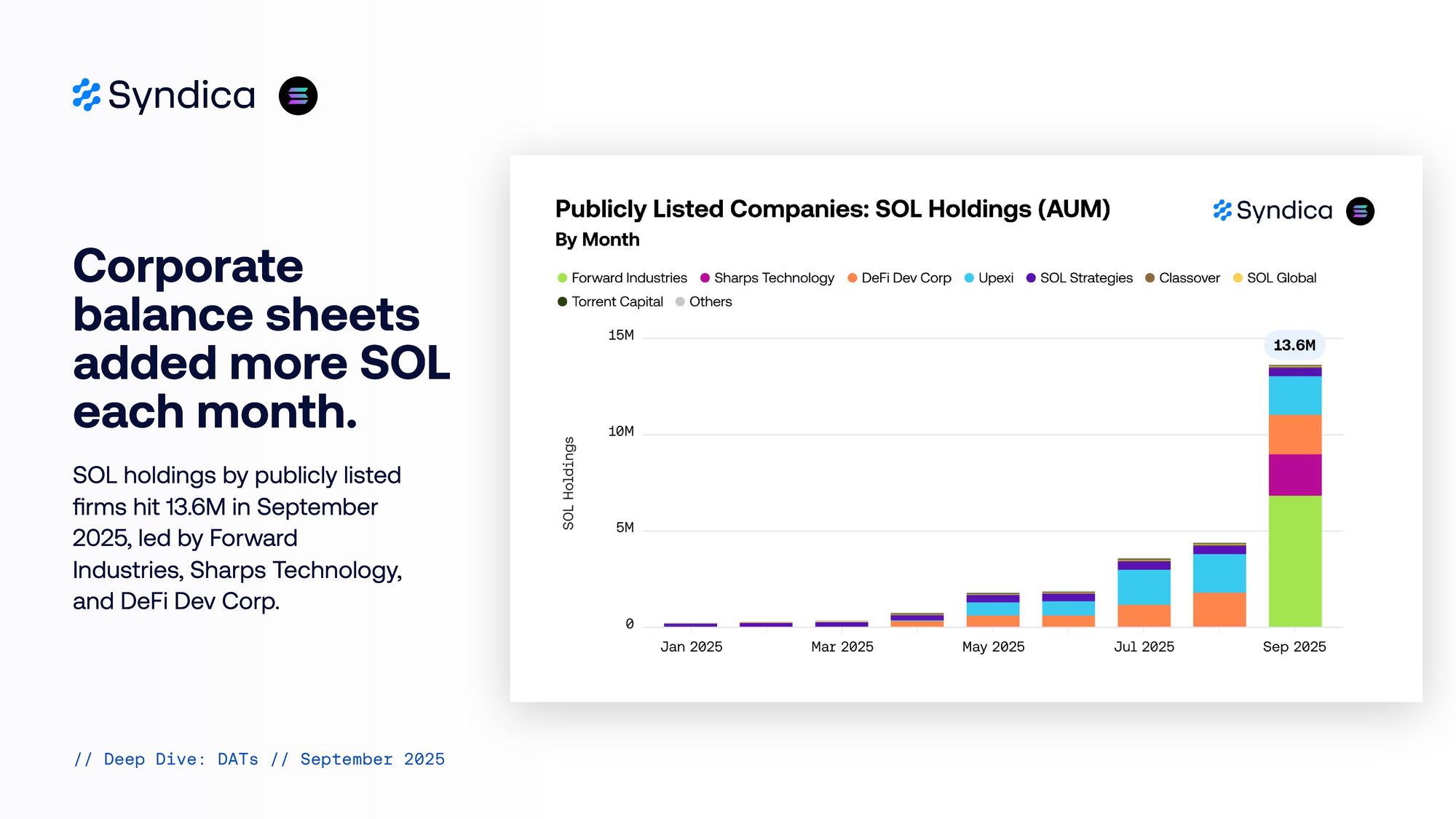 Corporate balance sheets added more SOL each month. SOL holdings by publicly listed firms hit 13.6M in September 2025, led by Forward Industries, Sharps Technology, and DeFi Dev Corp.