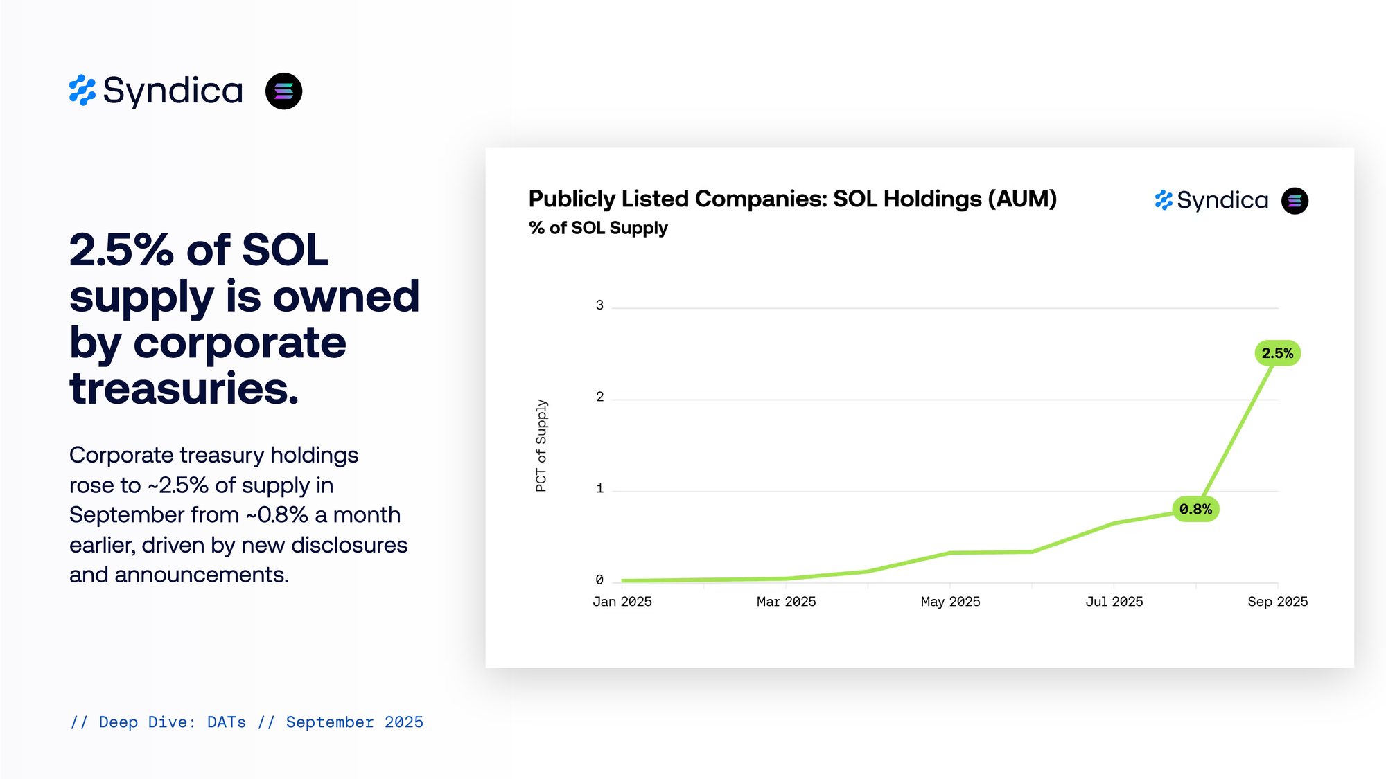 2.5% of SOL supply is owned by corporate treasuries. Corporate treasury holdings rose to ~2.5% of supply in September from ~0.8% a month earlier, driven by new disclosures and announcements.