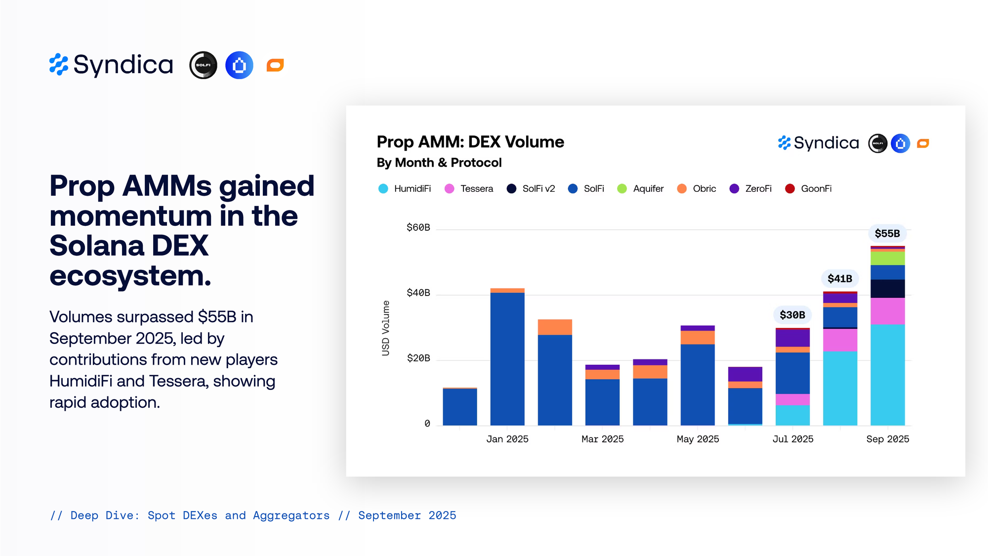 Prop AMMs gained momentum in the Solana DEX ecosystem. Volumes surpassed $55B in September 2025, led by contributions from new players HumidiFi and Tessera, showing rapid adoption.