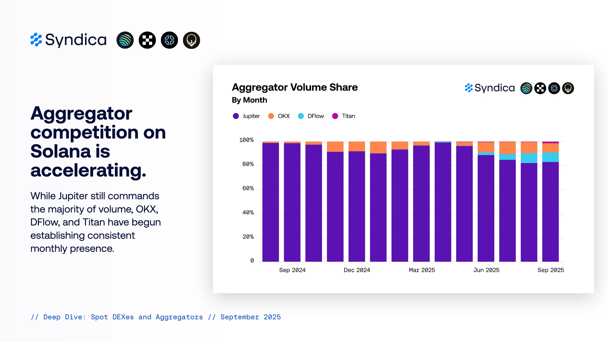Aggregator competition on Solana is accelerating. While Jupiter still commands the majority of volume, OKX, DFlow, and Titan have begun establishing consistent monthly presence.
