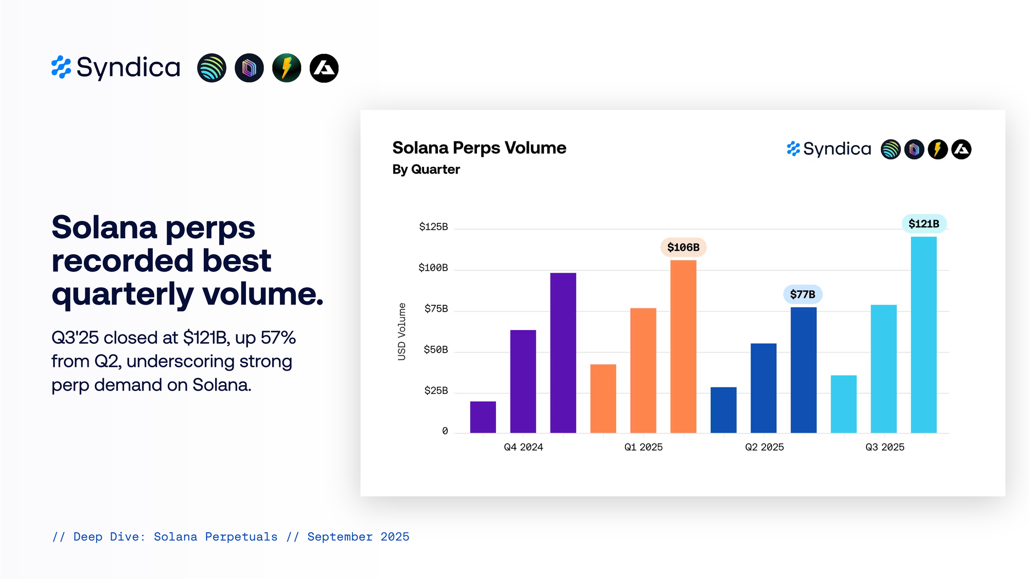 Solana perps recorded best quarterly volume. Q3'25 closed at $121B, up 57% from Q2, underscoring strong perp demand on Solana.