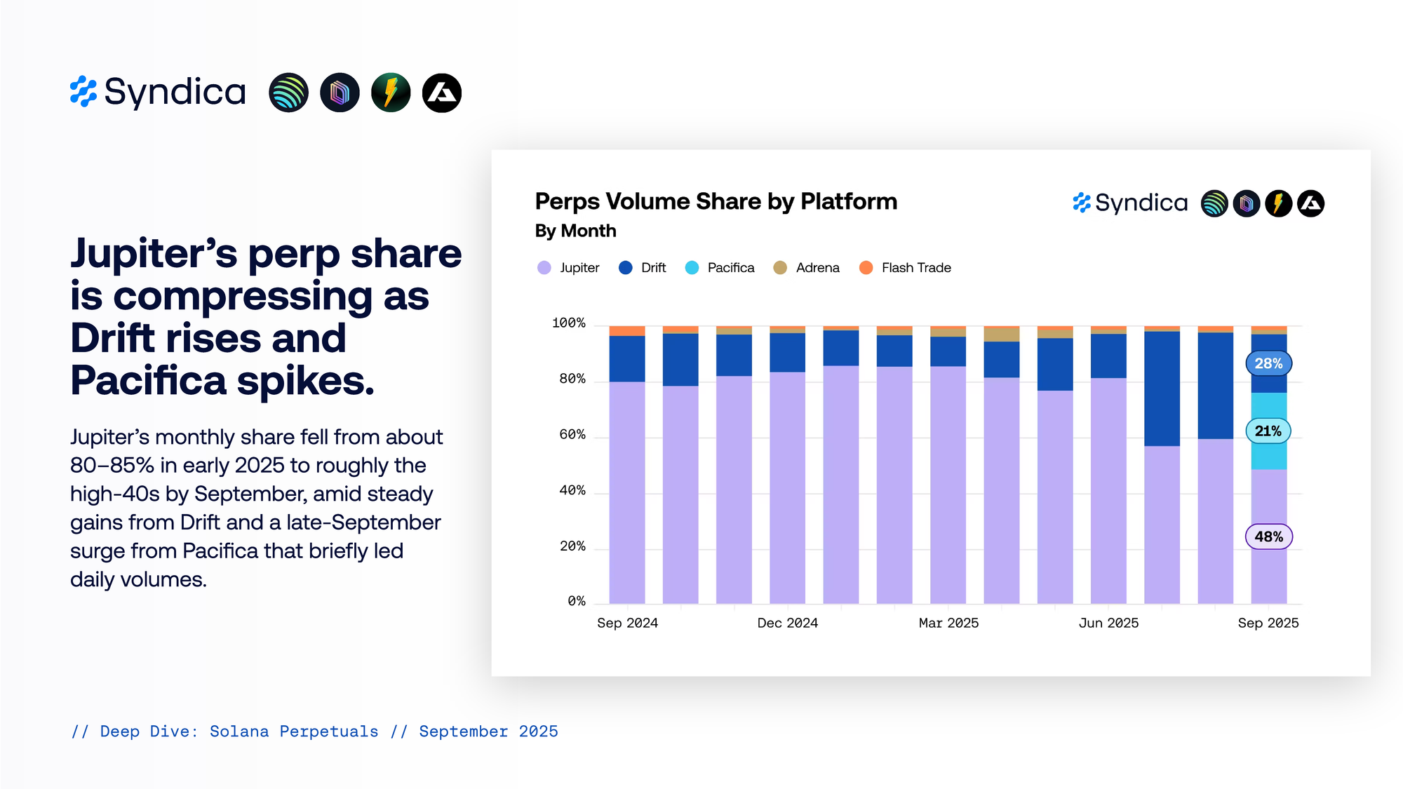 Jupiter’s perp share is compressing as Drift rises and Pacifica spikes. Jupiter’s monthly share fell from about 80–85% in early 2025 to roughly the high‑40s by September, amid steady gains from Drift and a late‑September surge from Pacifica that briefly led daily volumes.