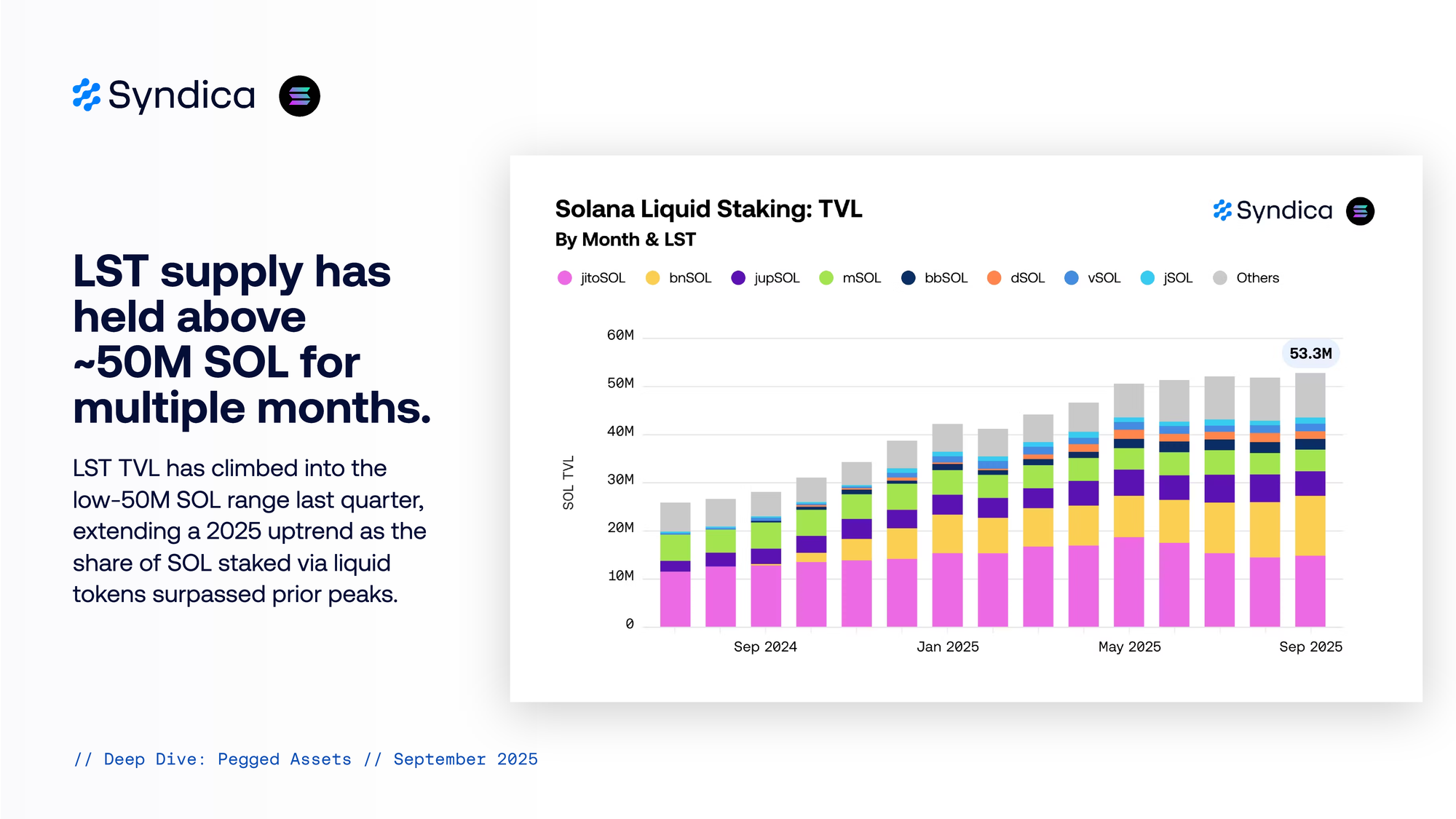 LST supply has held above ~50M SOL for multiple months. LST TVL has climbed into the low‑50M SOL range last quarter, extending a 2025 uptrend as the share of SOL staked via liquid tokens surpassed prior peaks.