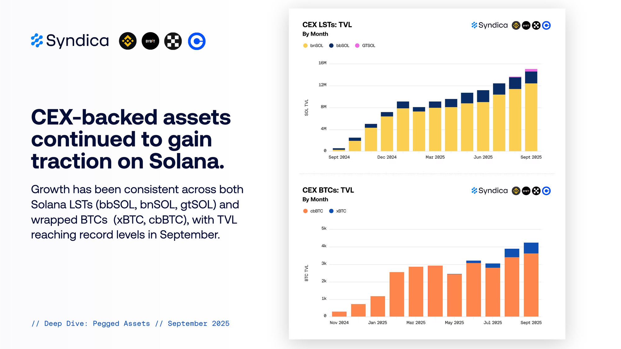 CEX-backed assets continued to gain traction on Solana. Growth has been consistent across both Solana LSTs (bbSOL, bnSOL, gtSOL) and wrapped BTCs (xBTC, cbBTC), with TVL reaching record levels in September.