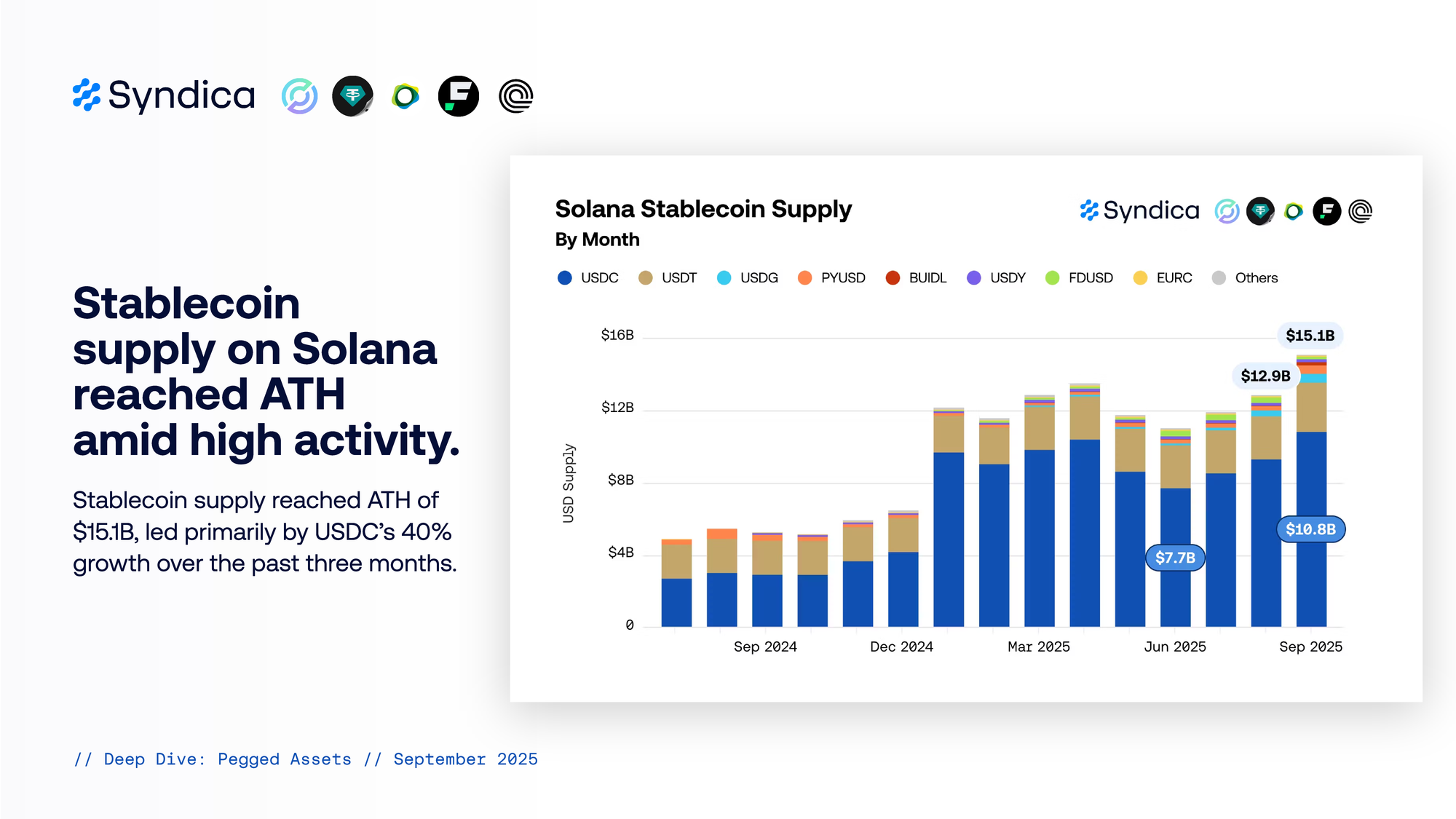 Stablecoin supply on Solana reached ATH amid high activity. Stablecoin supply reached ATH of $15.1B, led primarily by USDC’s 40% growth over the past three months.