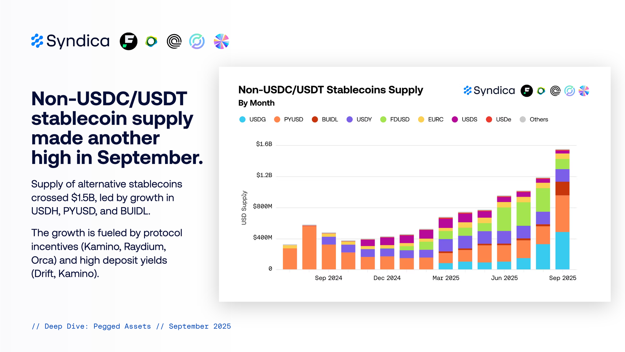 Non-USDC/USDT stablecoin supply made another high in September. Supply of alternative stablecoins crossed $1.5B, led by growth in USDH, PYUSD, and BUIDL. The growth is fueled by protocol incentives (Kamino, Raydium, Orca) and high deposit yields (Drift, Kamino).