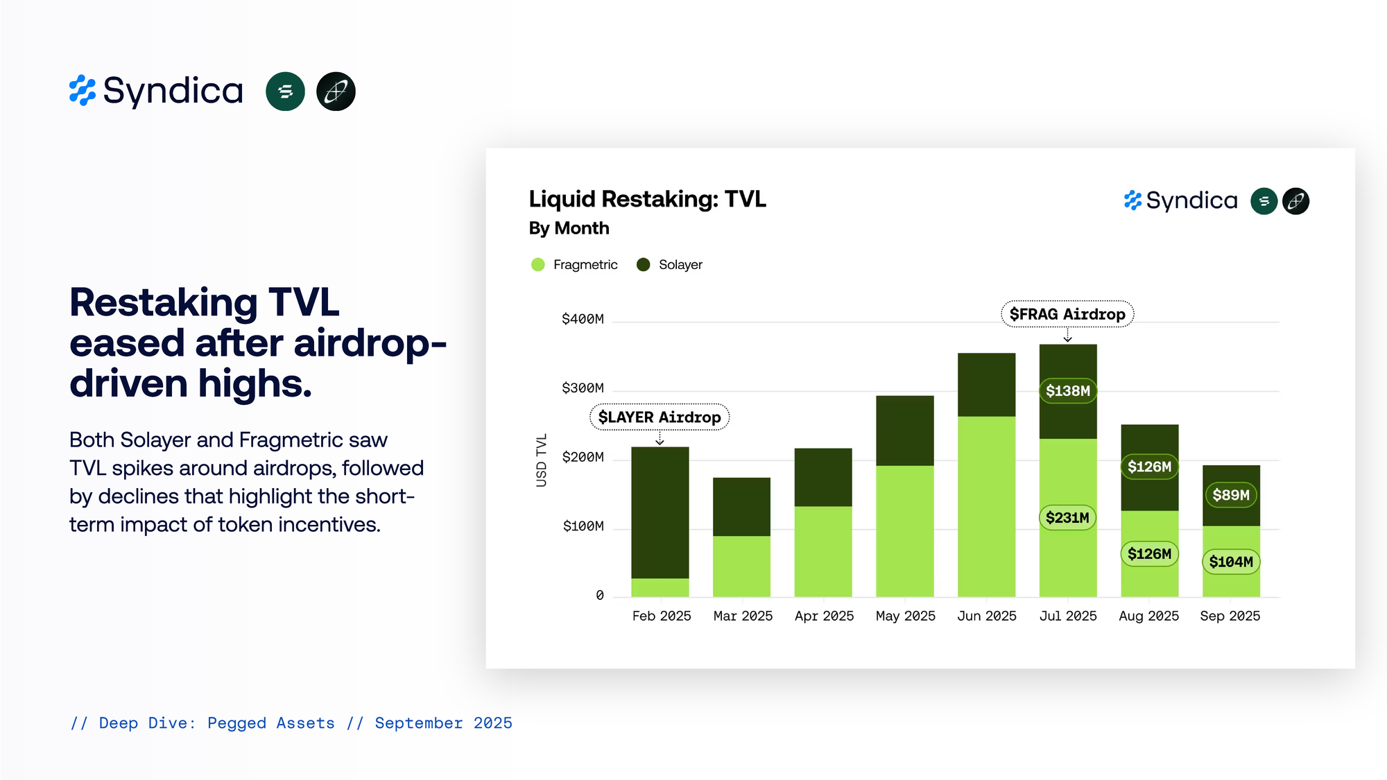 Restaking TVL eased after airdrop-driven highs. Both Solayer and Fragmetric saw TVL spikes around airdrops, followed by declines that highlight the short-term impact of token incentives.