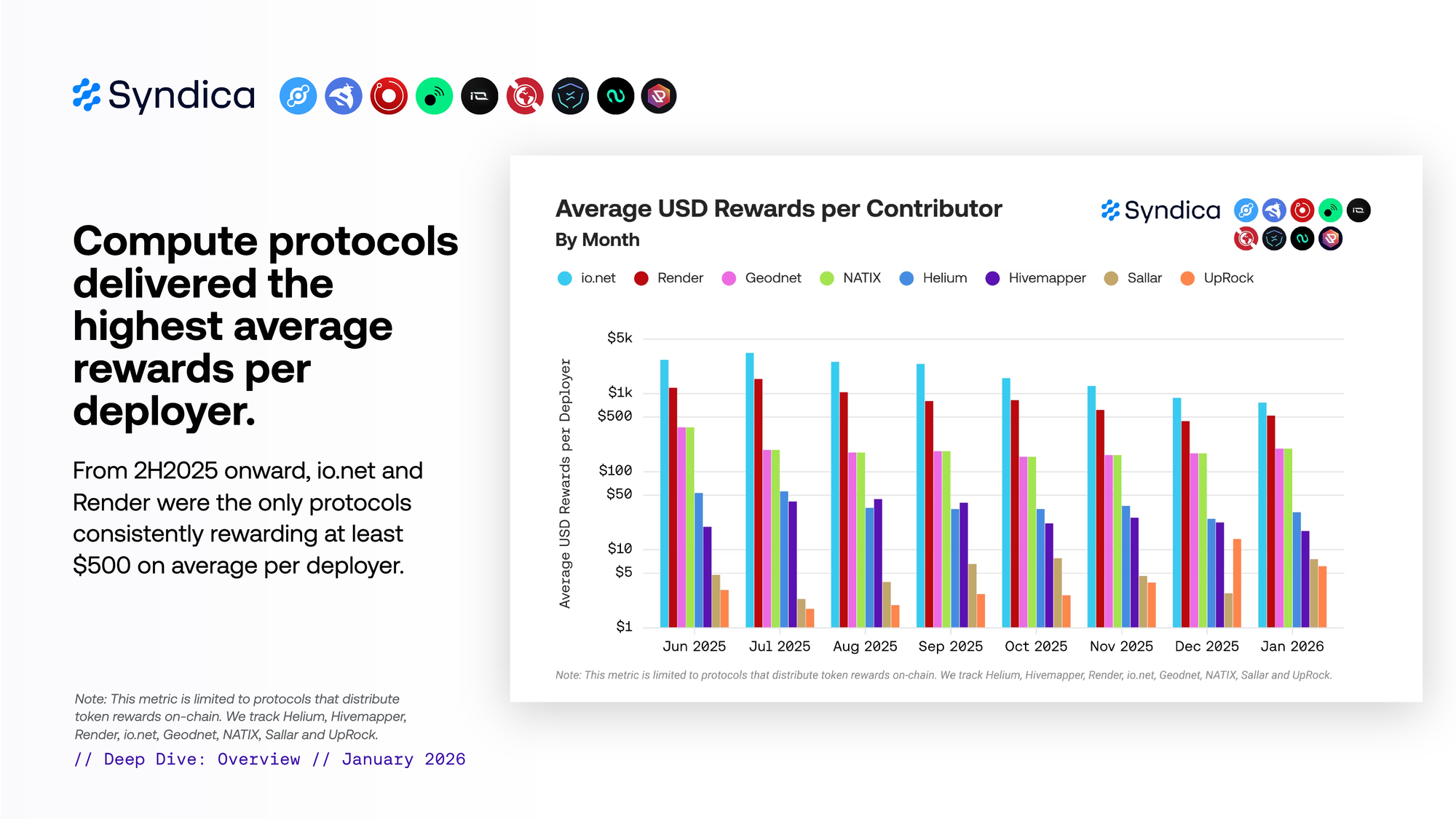 From 2H2025 onward, io.net and Render were the only protocols consistently rewarding at least $500 on average per deployer.