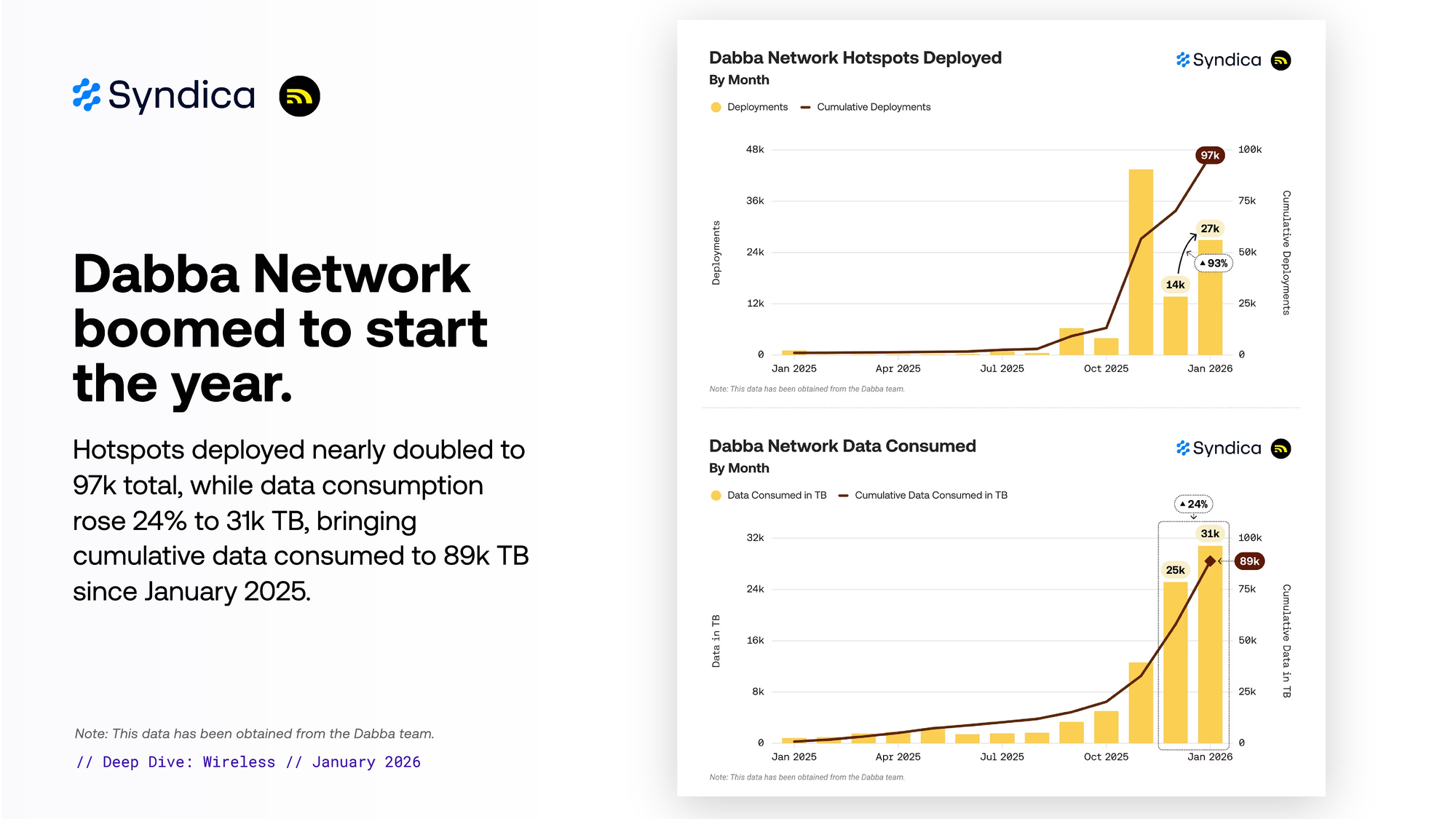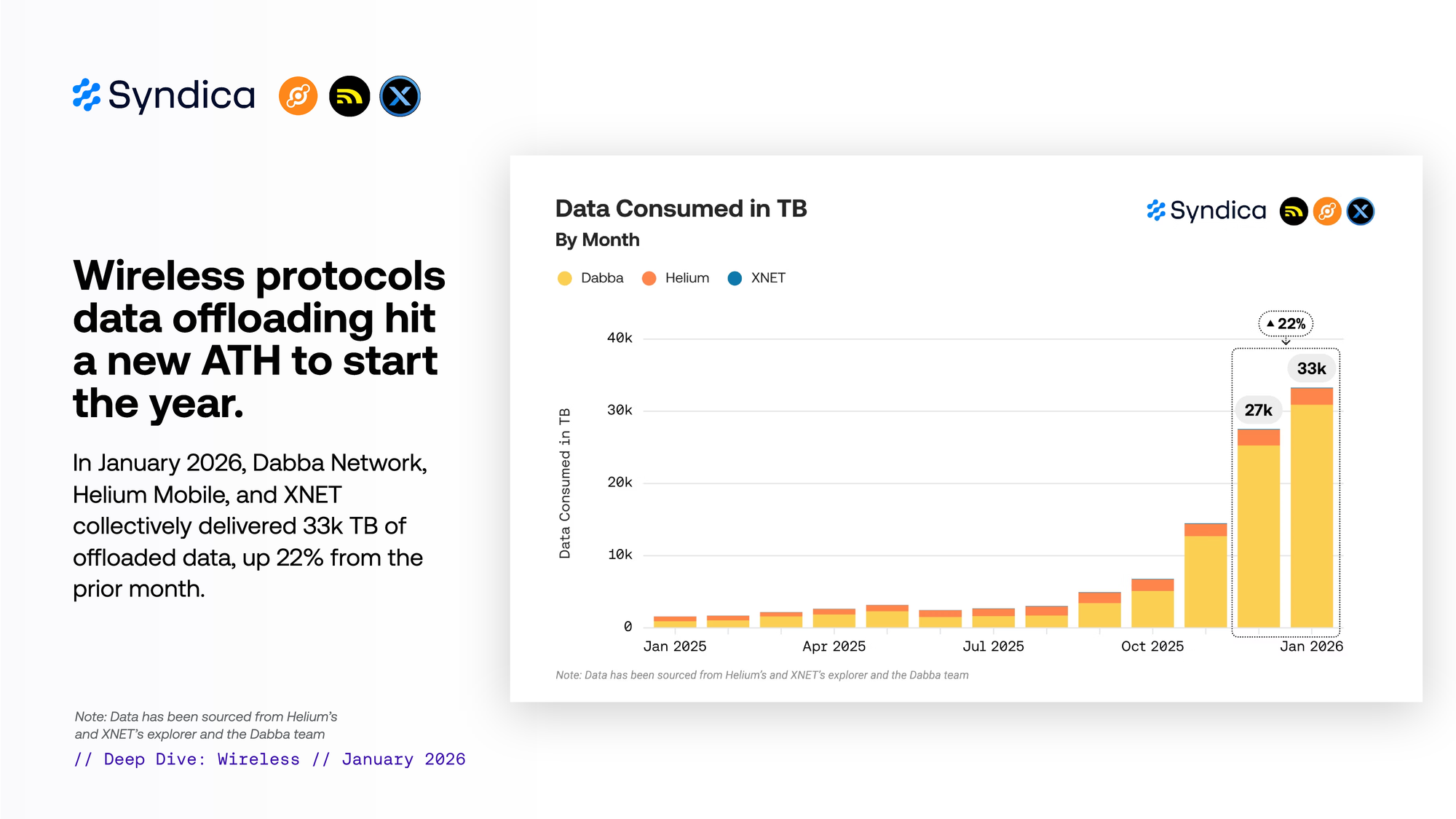 In January 2026, Dabba Network, Helium Mobile, and XNET collectively delivered 33k TB of offloaded data, up 22% from the prior month.