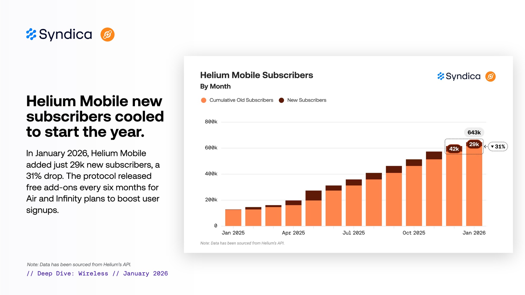 In January 2026, Helium Mobile added just 29k new subscribers, a 31% drop. The protocol released free add-ons every six months for Air and Infinity plans to boost user signups.