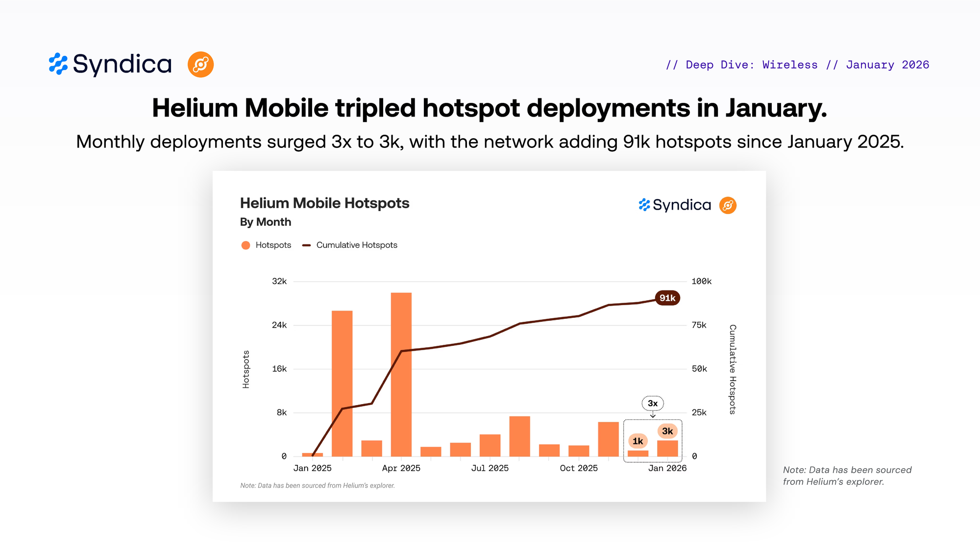 Helium Mobile tripled hotspot deployments in January. Monthly deployments surged 3x to 3k, with the network adding 91k hotspots since January 2025.