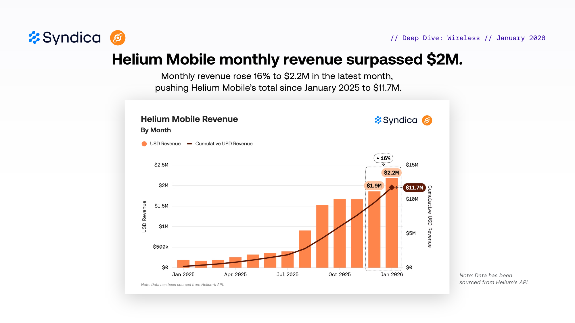 Helium Mobile monthly revenue surpassed $2M. Monthly revenue rose 16% to $2.2M in the latest month, pushing Helium Mobile’s total since January 2025 to $11.7M.