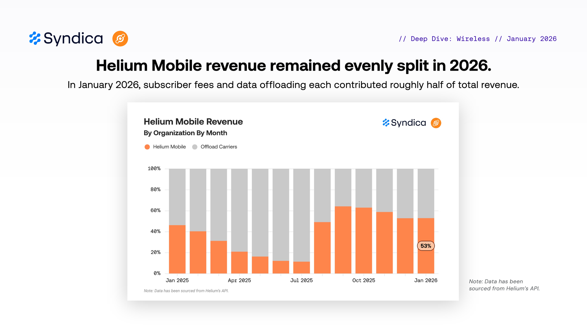 Helium Mobile revenue remained evenly split in 2026. In January 2026, subscriber fees and data offloading each contributed roughly half of total revenue.