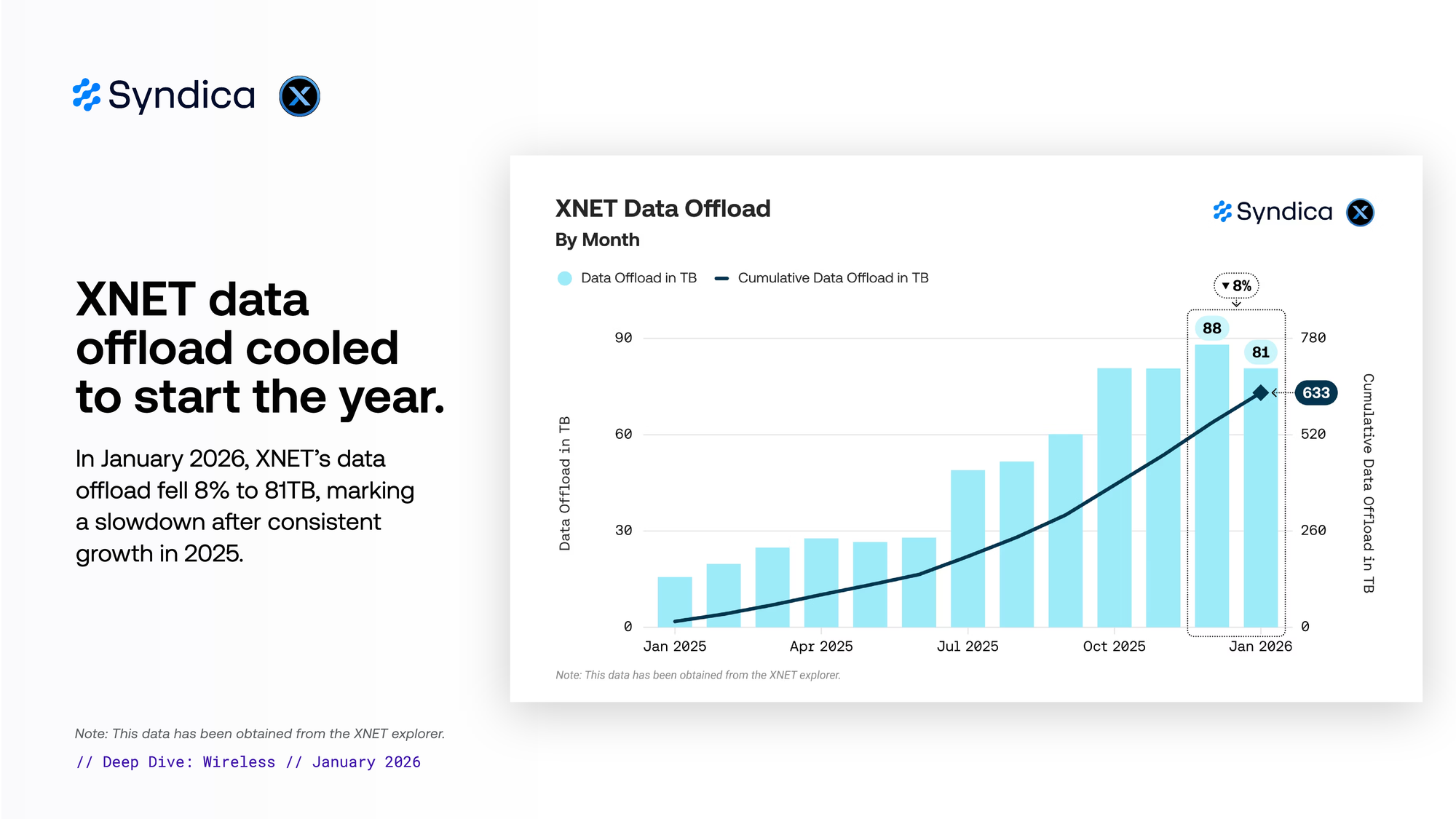 In January 2026, XNET’s data offload fell 8% to 81TB, marking a slowdown after consistent growth in 2025.
