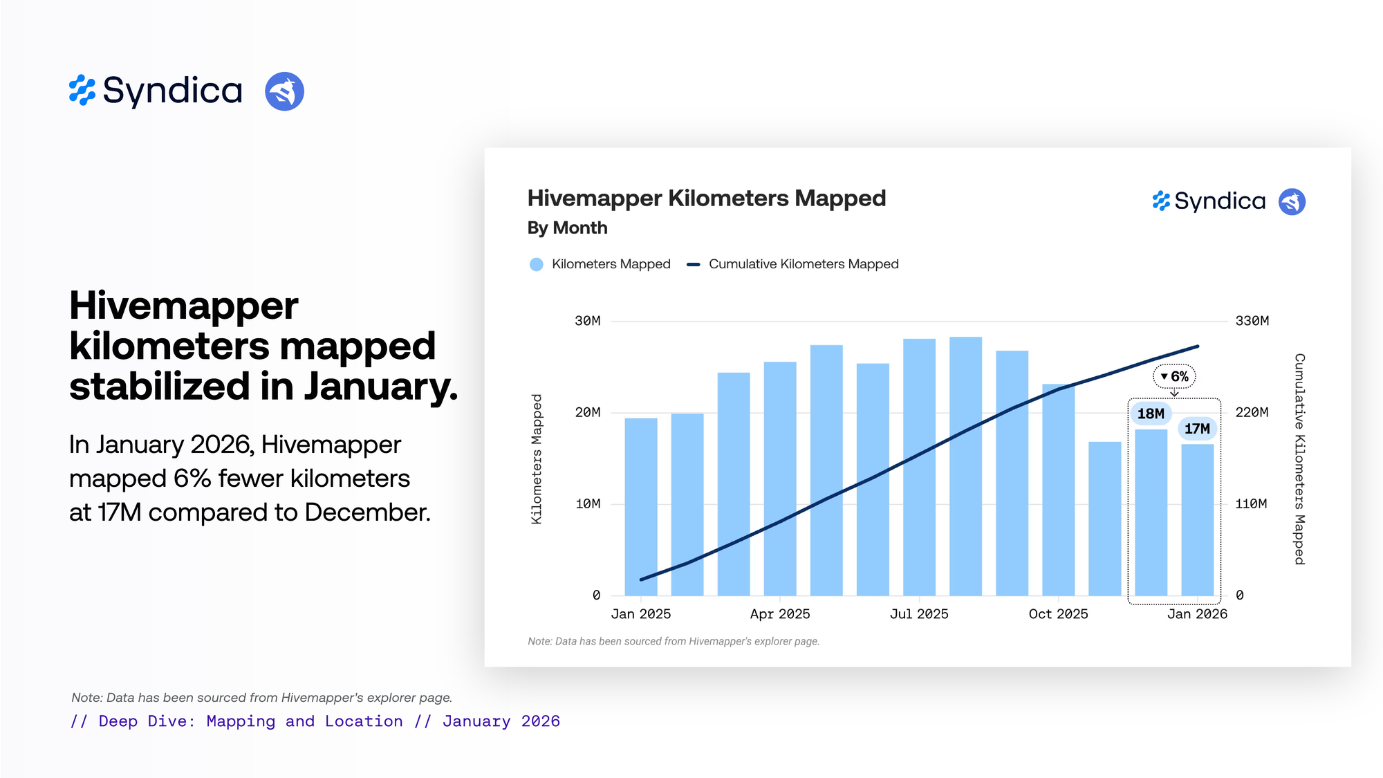 In January 2026, Hivemapper mapped 6% fewer kilometers at 17M compared to December.
