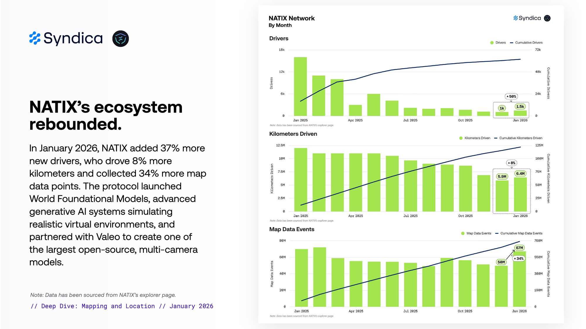 In January 2026, NATIX added 37% more new drivers, who drove 8% more kilometers and collected 34% more map data points. The protocol launched World Foundational Models, advanced generative AI systems simulating realistic virtual environments, and partnered with Valeo to create one of the largest open-source, multi-camera models.