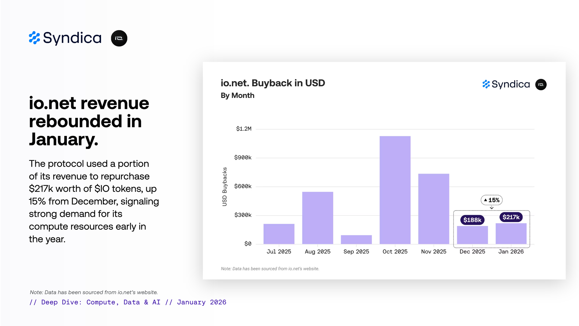 The protocol used a portion of its revenue to repurchase $217k worth of $IO tokens, up 15% from December, signaling strong demand for its compute resources early in the year.
