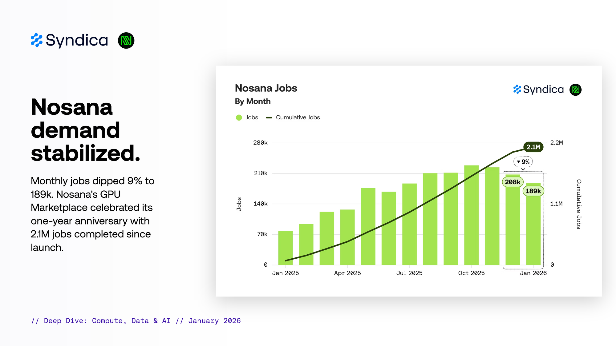 Monthly jobs dipped 9% to 189k. Nosana’s GPU Marketplace celebrated its one-year anniversary with 2.1M jobs completed since launch.
