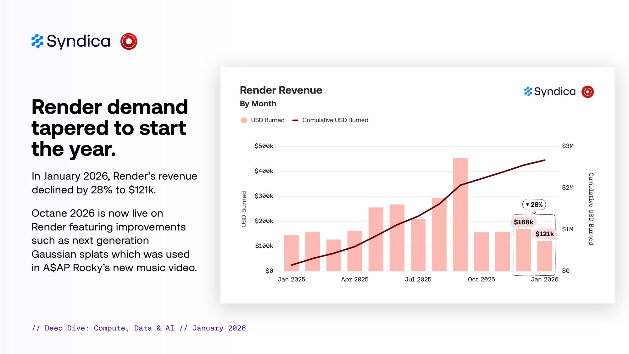 In January 2026, Render’s revenue declined by 28% to $121k. Octane 2026 is now live on Render featuring improvements such as next generation Gaussian splats which was used in A$AP Rocky’s new music video.