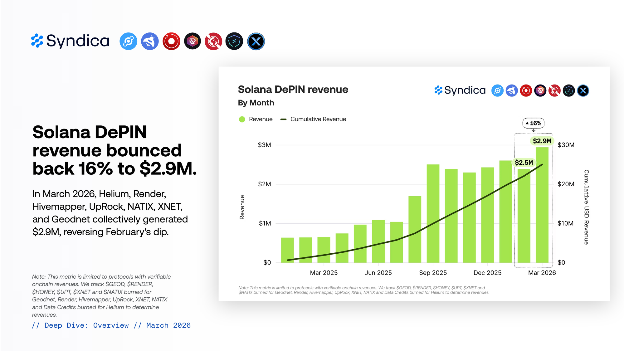 In March 2026, Helium, Render, Hivemapper, UpRock, NATIX, XNET, and Geodnet collectively generated $2.9M, reversing February's dip.