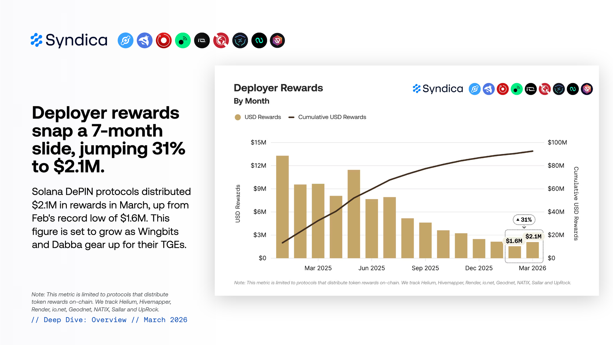 Solana DePIN protocols distributed $2.1M in rewards in March, up from Feb's record low of $1.6M. This figure is set to grow as Wingbits and Dabba gear up for their TGEs.