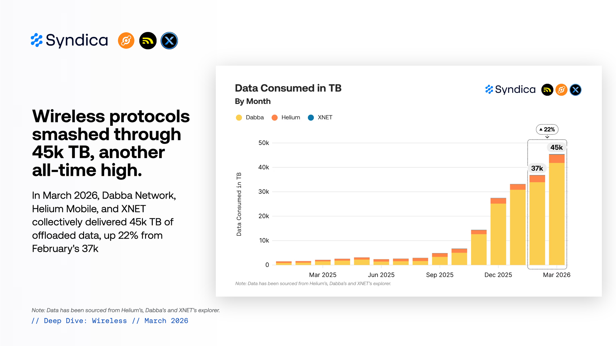 In March 2026, Dabba Network, Helium Mobile, and XNET collectively delivered 45k TB of offloaded data, up 22% from February's 37k TB.