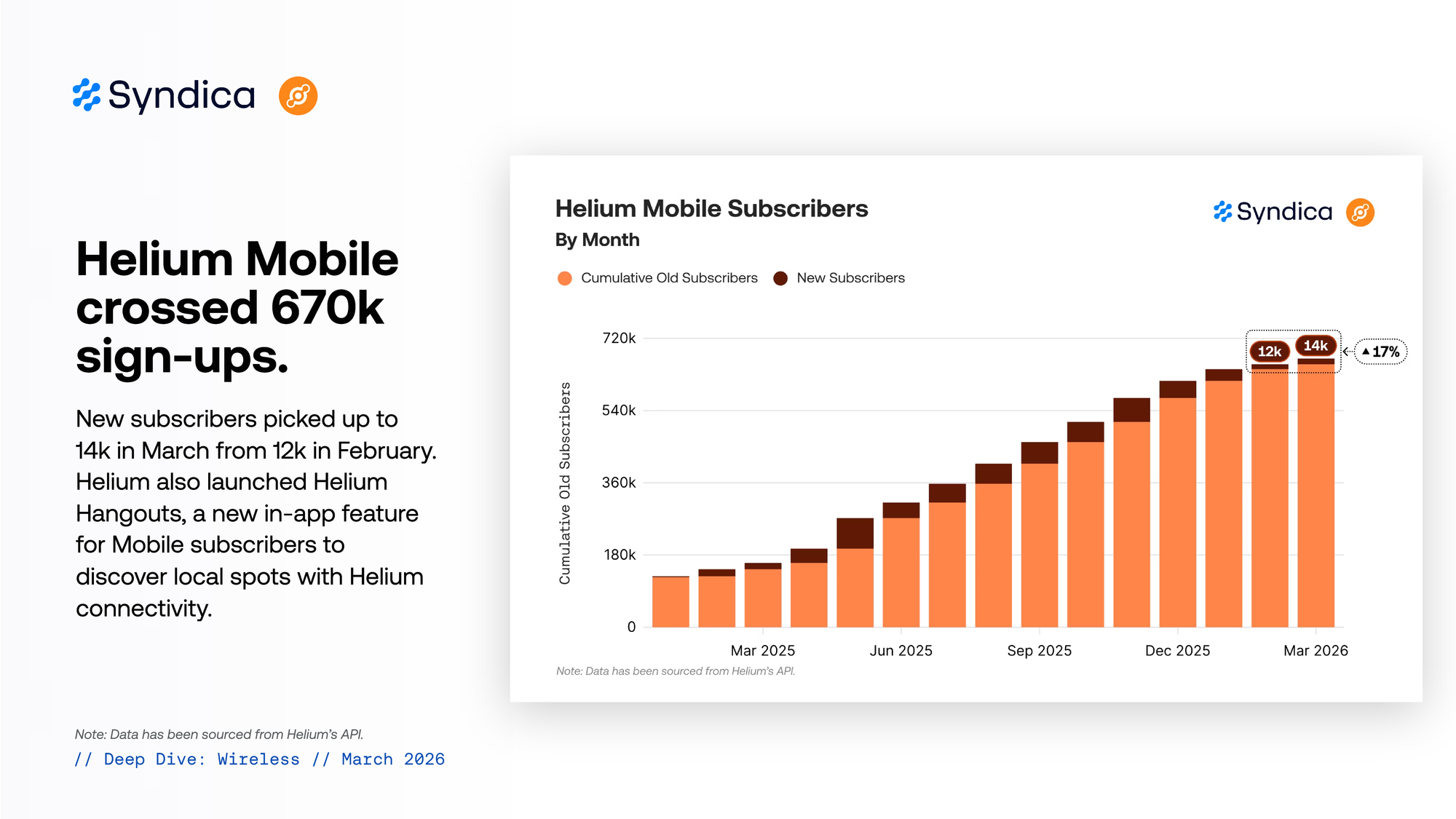 New subscribers picked up to 14k in March from 12k in February. Helium also launched Helium Hangouts, a new in-app feature for Mobile subscribers to discover local spots with Helium connectivity.