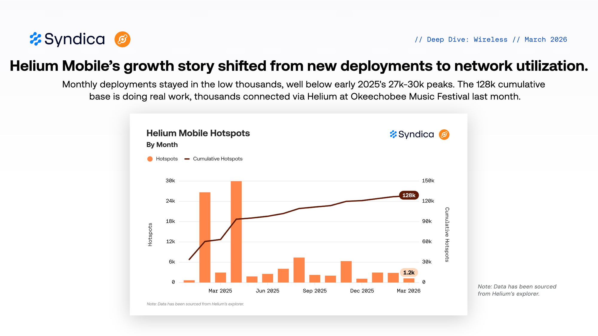 Monthly deployments stayed in the low thousands, well below early 2025's 27k-30k peaks. The 128k cumulative base is doing real work, thousands connected via Helium at Okeechobee Music Festival last month.