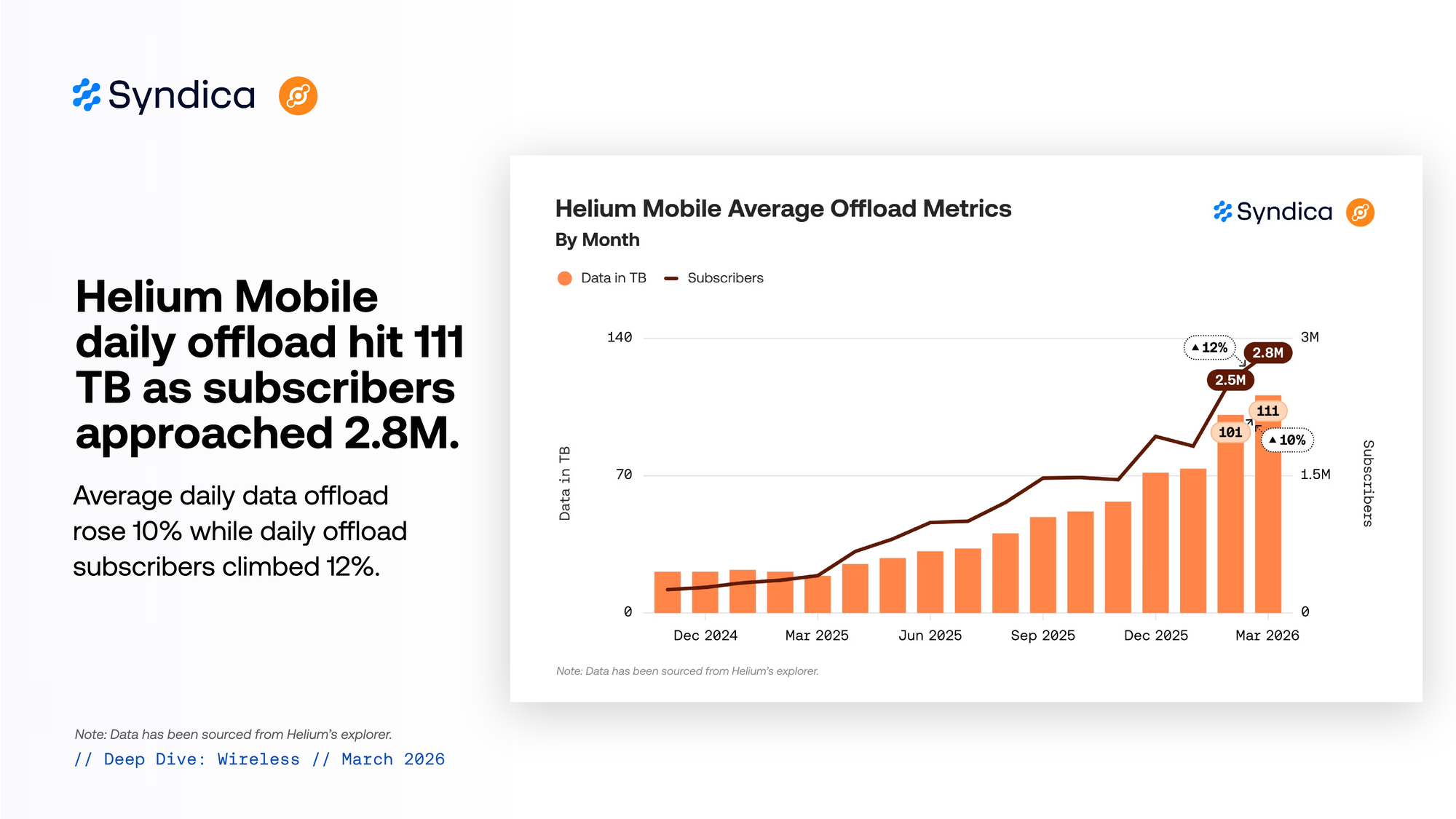 Helium daily offload hit 111 TB as subscribers approached 2.8M.