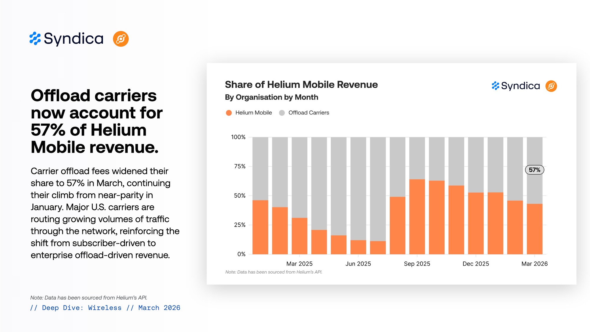 Offload carriers now account for 57% of Helium Mobile revenue.
