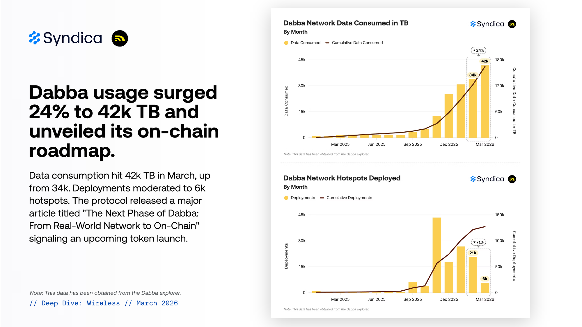 Data consumption hit 42k TB in March, up from 34k. Deployments moderated to 6k hotspots. The protocol released a major article titled "The Next Phase of Dabba: From Real-World Network to On-Chain" signaling an upcoming token launch.