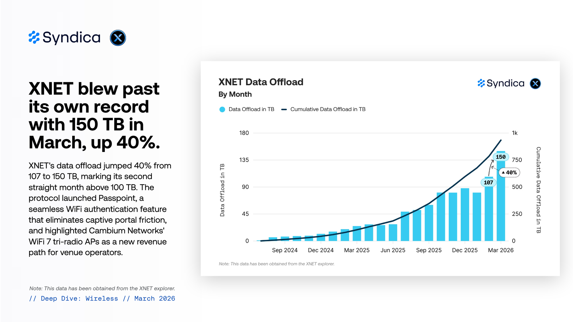 XNET's data offload jumped 40% from 107 to 150 TB, marking its second straight month above 100 TB. The protocol launched Passpoint, a seamless WiFi authentication feature that eliminates captive portal friction, and highlighted Cambium Networks' WiFi 7 tri-radio APs as a new revenue path for venue operators.