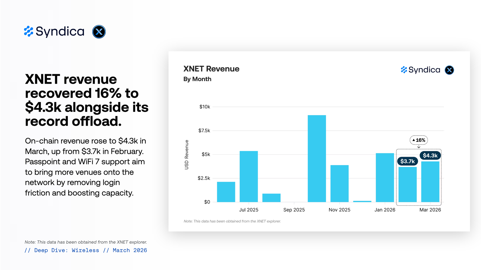 On-chain revenue rose to $4.3k in March, up from $3.7k in February. Passpoint and WiFi 7 support aim to bring more venues onto the network by removing login friction and boosting capacity.