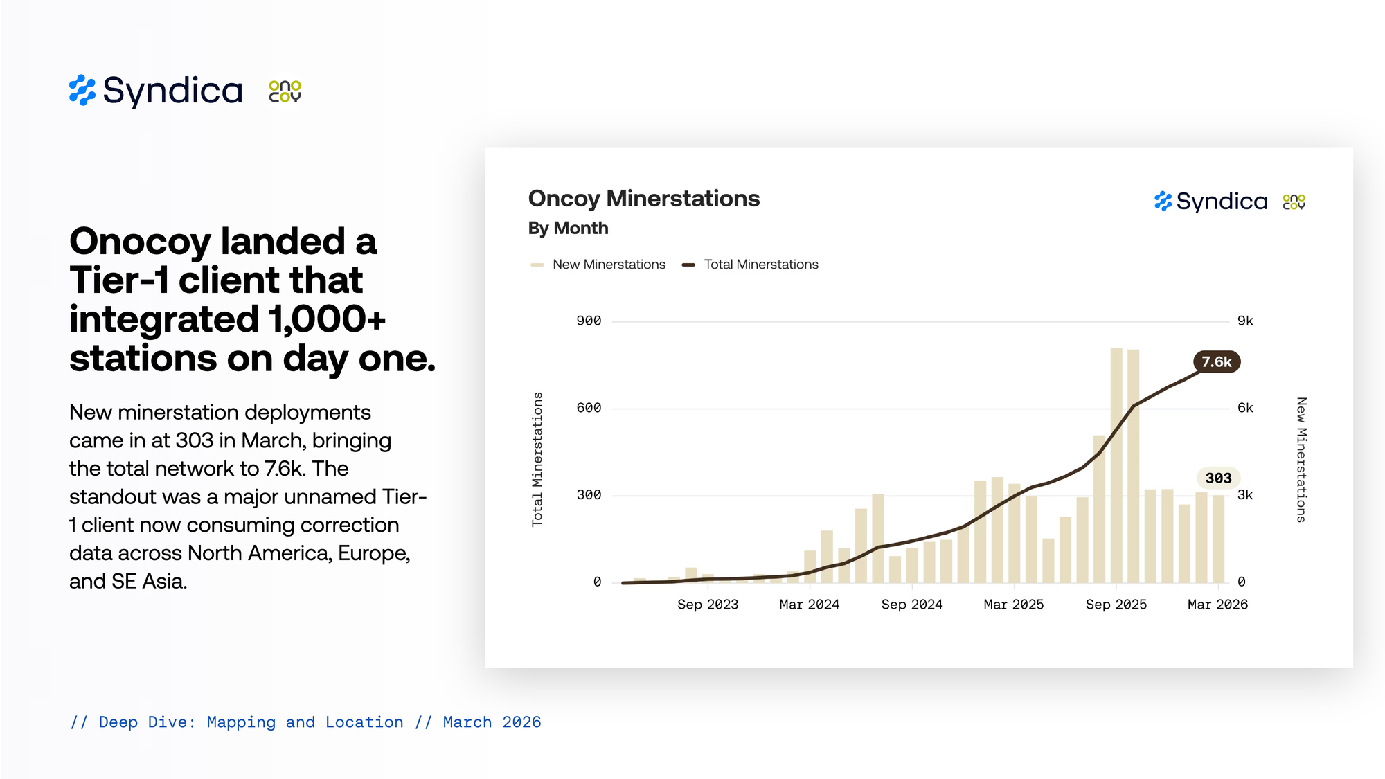 New minerstation deployments came in at 303 in March, bringing the total network to 7.6k. The standout was a major unnamed Tier-1 client now consuming correction data across North America, Europe, and SE Asia.