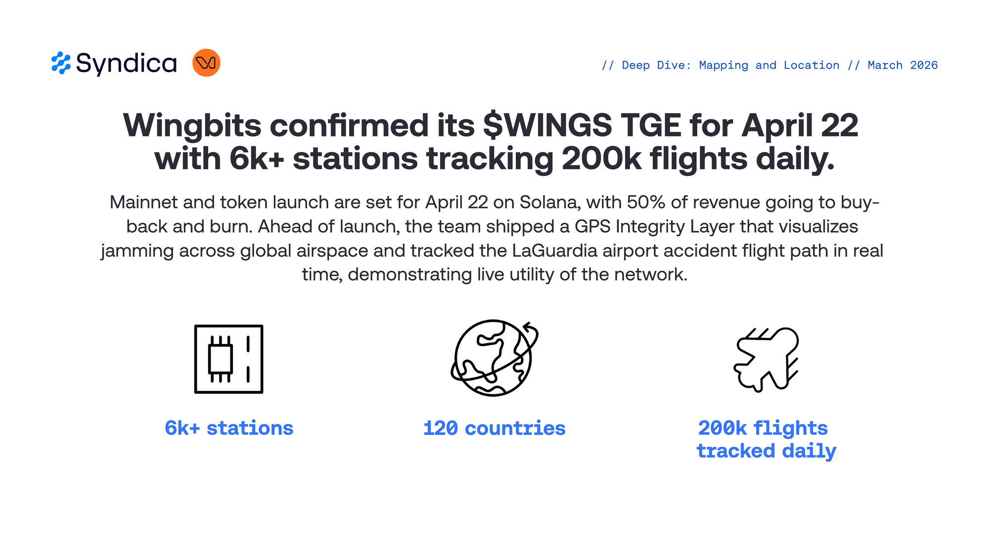 Mainnet and token launch are set for April 22 on Solana, with 50% of revenue going to buy-back and burn. Ahead of launch, the team shipped a GPS Integrity Layer that visualizes jamming across global airspace and tracked the LaGuardia airport accident flight path in real time, demonstrating live utility of the network.