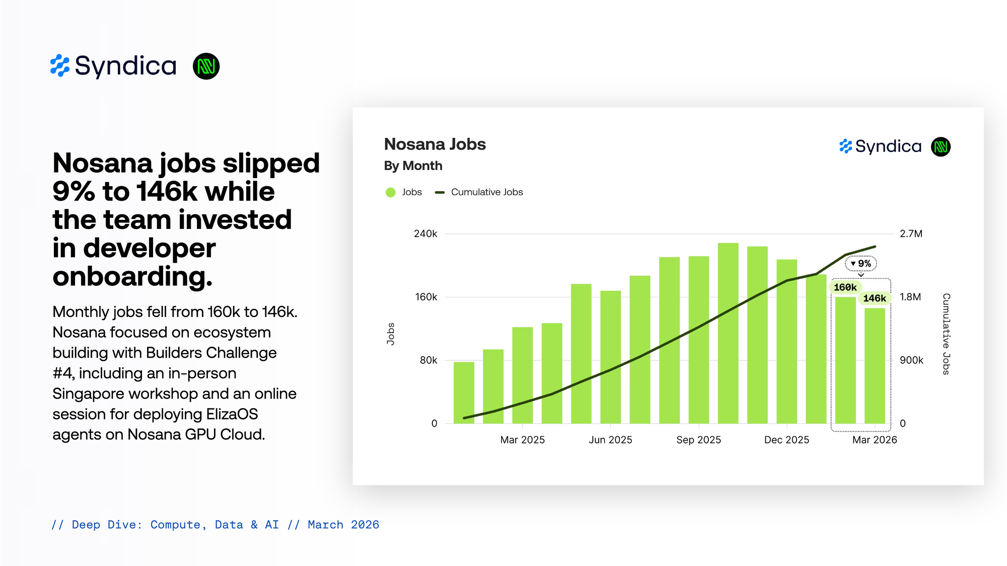 Nosana jobs slipped 9% to 146k while the team invested in developer onboarding.