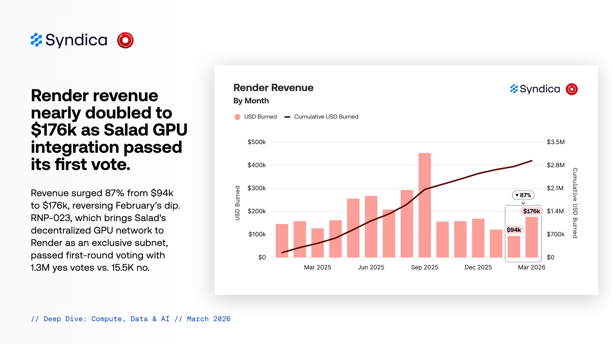 Revenue surged 87% from $94k to $176k, reversing February's dip. RNP-023, which brings Salad's decentralized GPU network to Render as an exclusive subnet, passed first-round voting with 1.3M yes votes vs. 15.5K no.